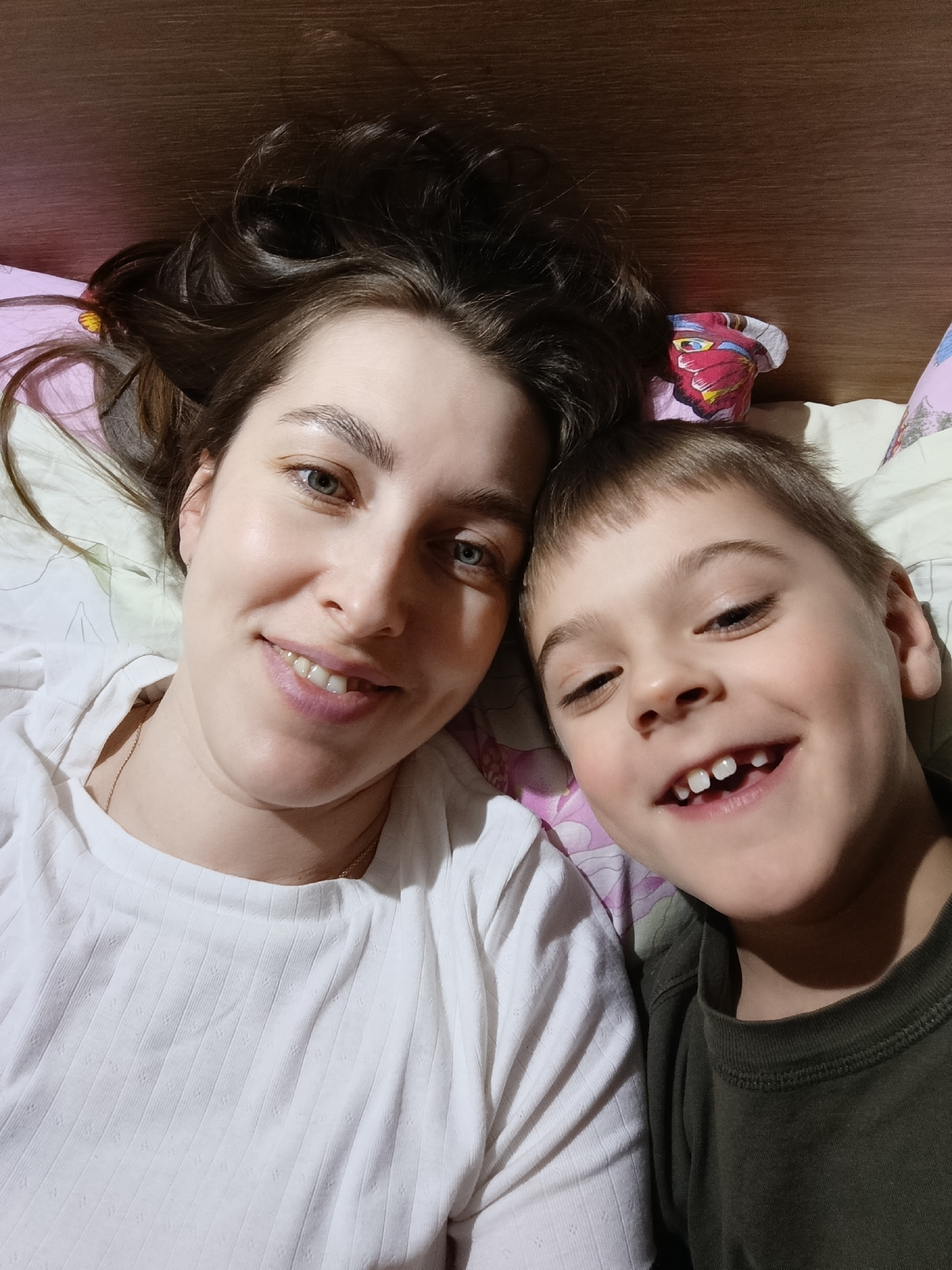 A selfie shows a woman and a boy lying next to each other on bedding. The woman has long brown hair and is wearing a white shirt. The boy has short brown hair and is wearing a dark green shirt. Both a…read more