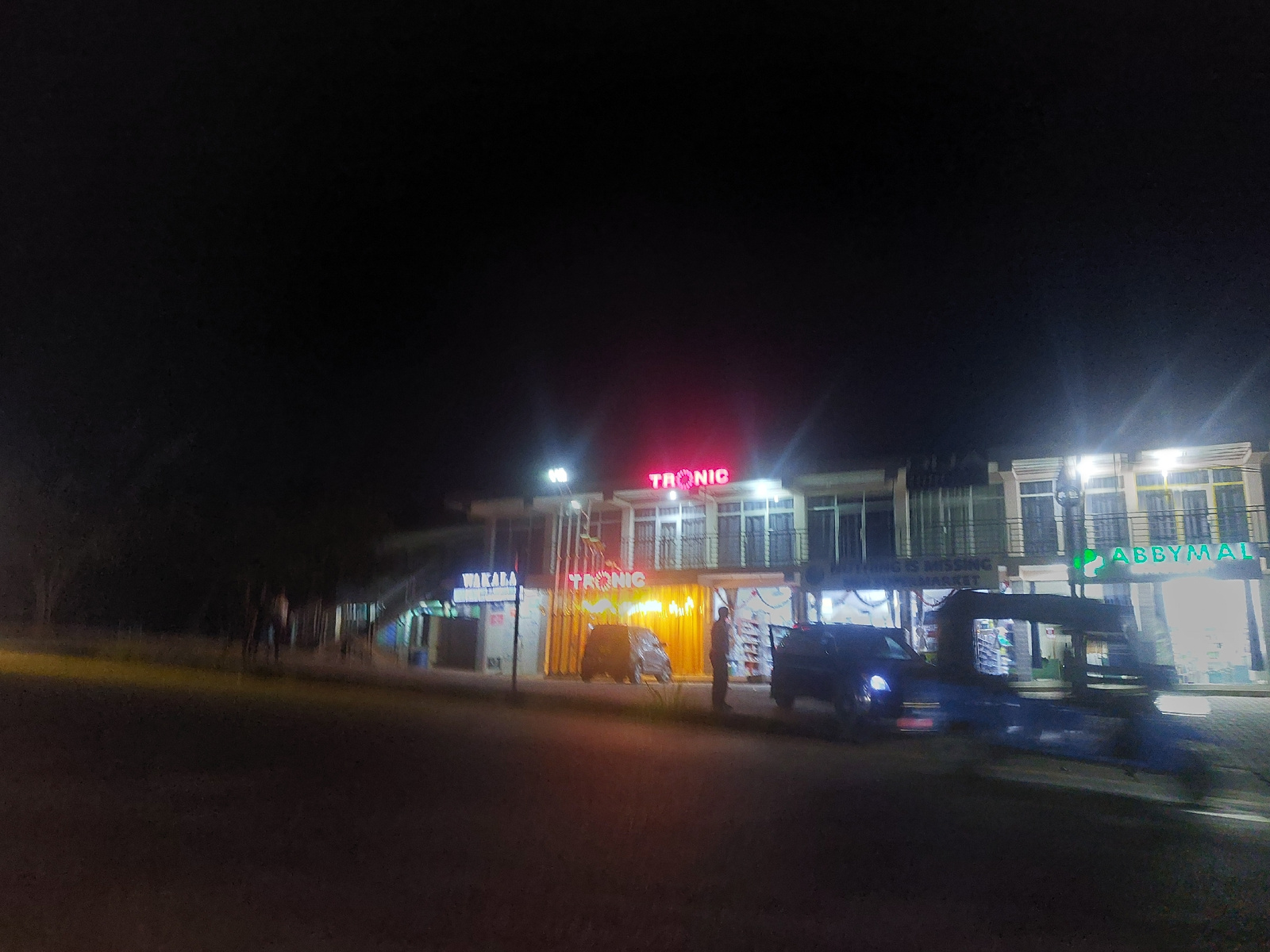 At night in Dar es-Salaam, Tanzania, a multi-story commercial building is visible. The building has signage for "TRONIC" in large, red neon letters on the upper level and a smaller sign above the entr…read more