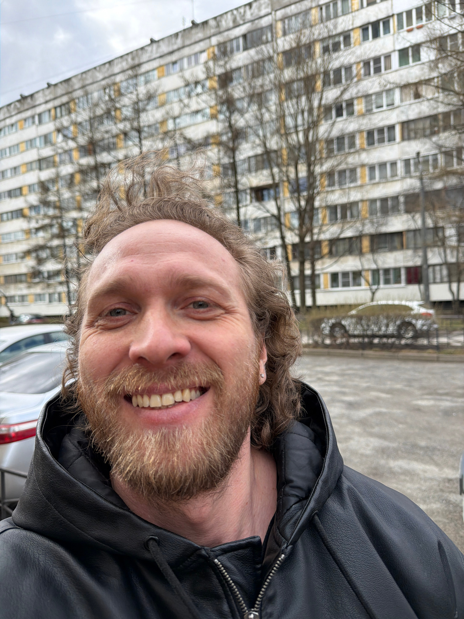 A Caucasian man with light-brown curly hair and a thick beard is the primary subject of the image. He is wearing a black leather jacket with the zipper partially open, suggesting cool weather. His fac…read more