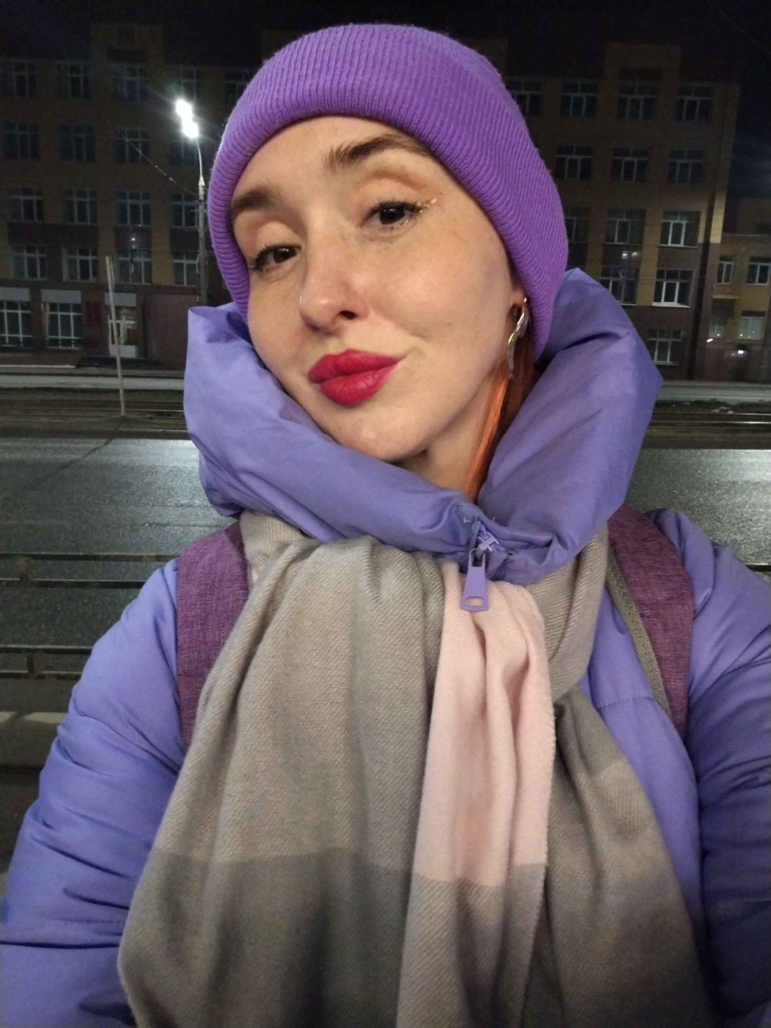 A woman is taking a selfie outdoors at night. She is wearing a purple beanie, a purple puffer jacket, and a grey and pink scarf. She has red lipstick and visible earrings. Behind her is a city scene w…read more