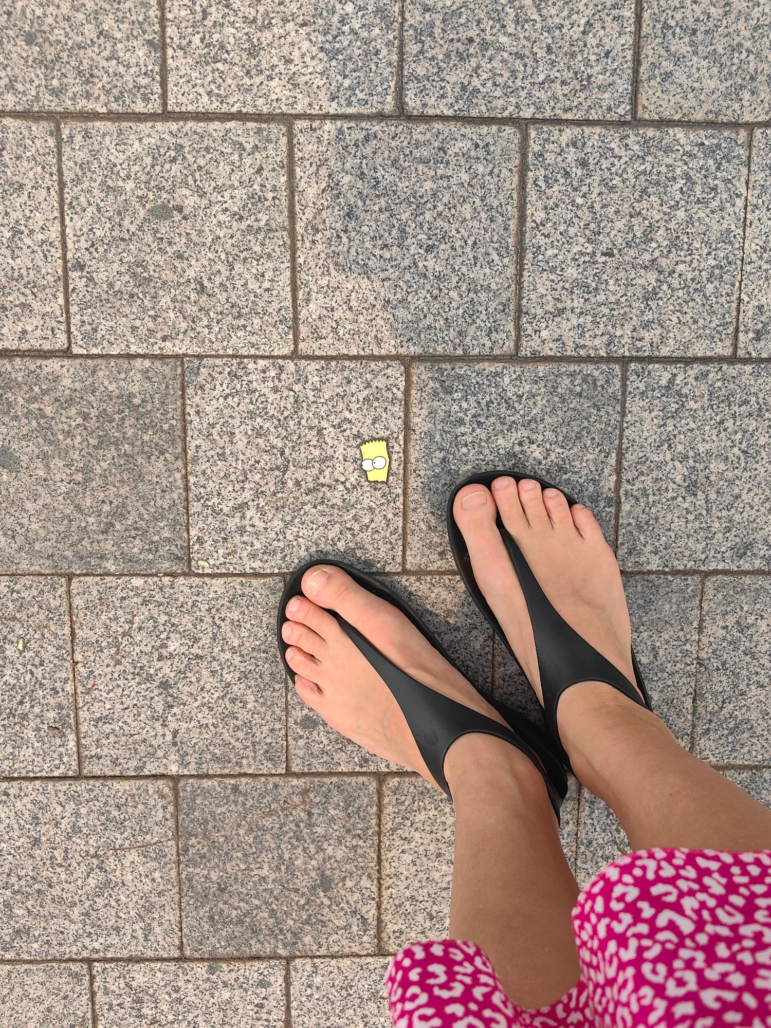 A top-down shot shows a person's feet in black flip-flops standing on a grey stone tile pavement. A small, yellow Bart Simpson figure lies between the feet and the person's left foot. The person is we…read more