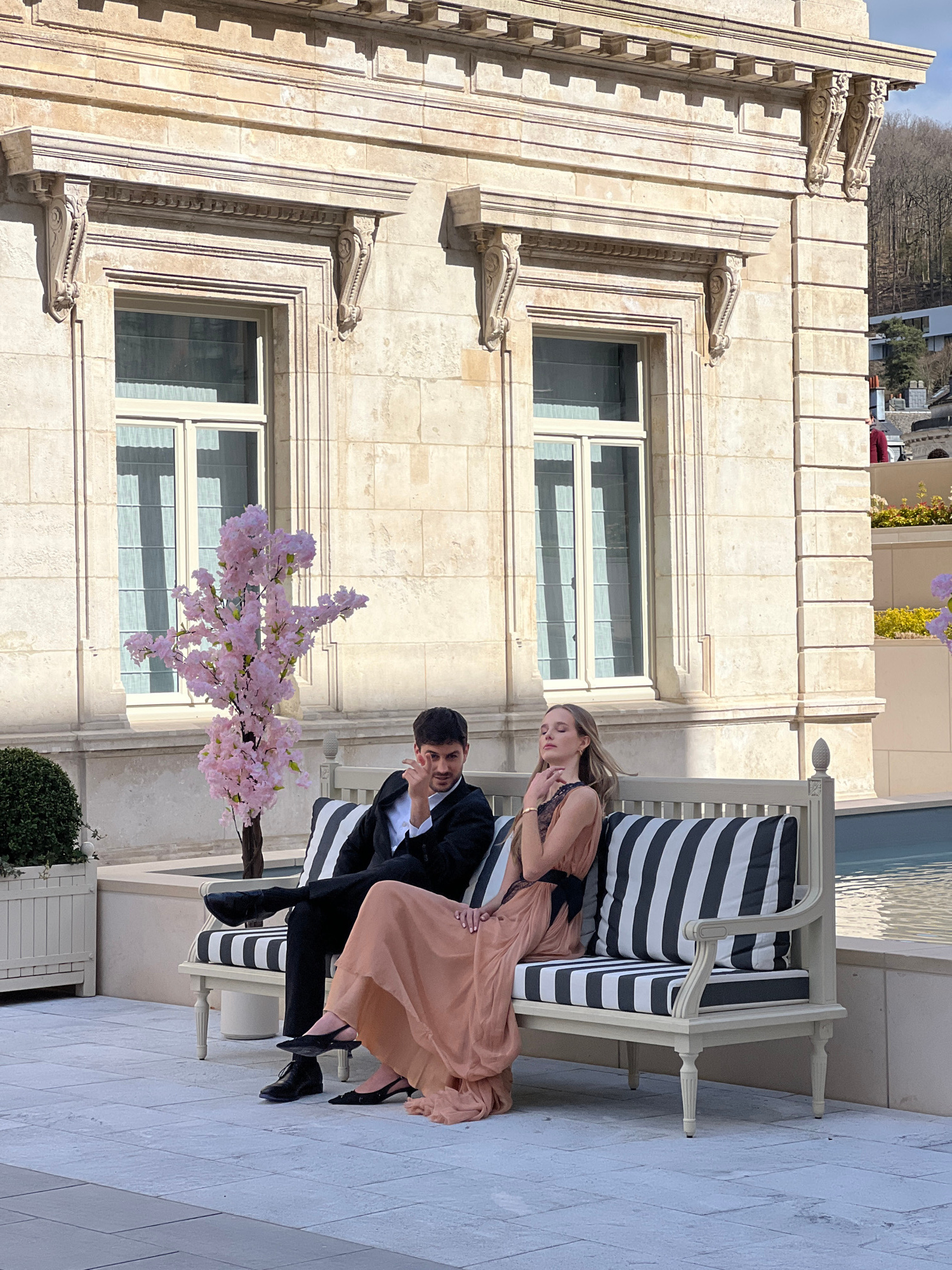 On an outdoor tiled patio adjacent to a multi-story building constructed of light-colored stone, a man and a woman are seated on a striped settee. The woman, dressed in a long light peach gown with a…read more