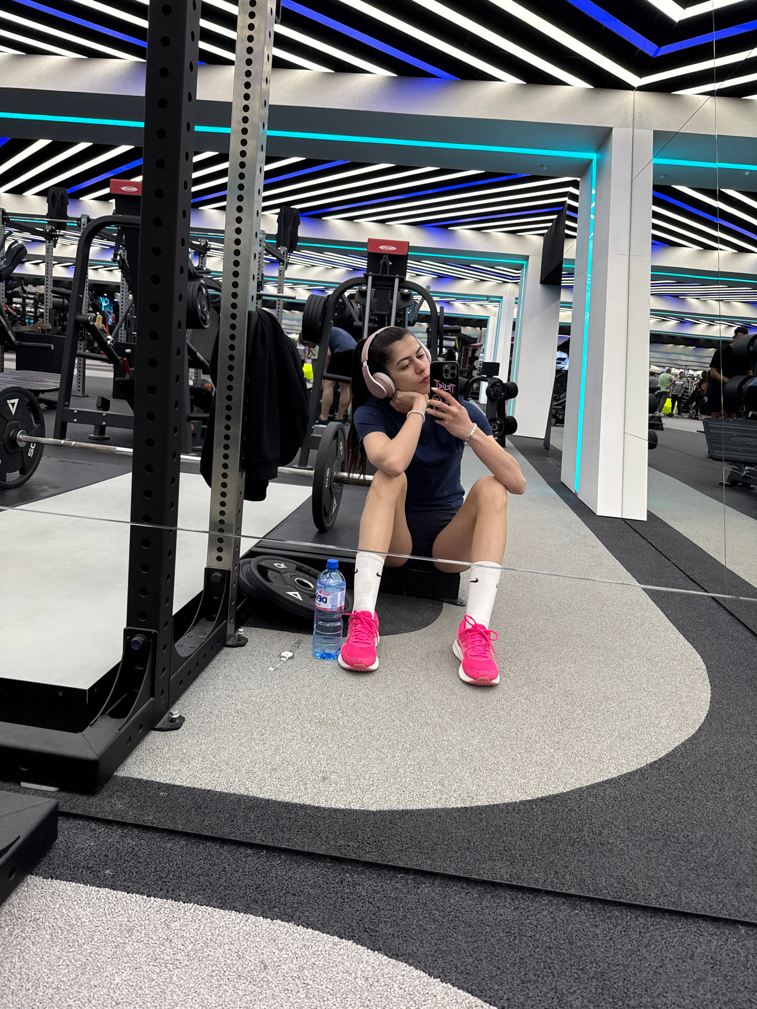 A woman is sitting on the floor of a gym in Sofia, Bulgaria, leaning against a weight rack with a water bottle and her phone. She is wearing pink headphones, a dark shirt, dark shorts, white socks, anβ¦read more