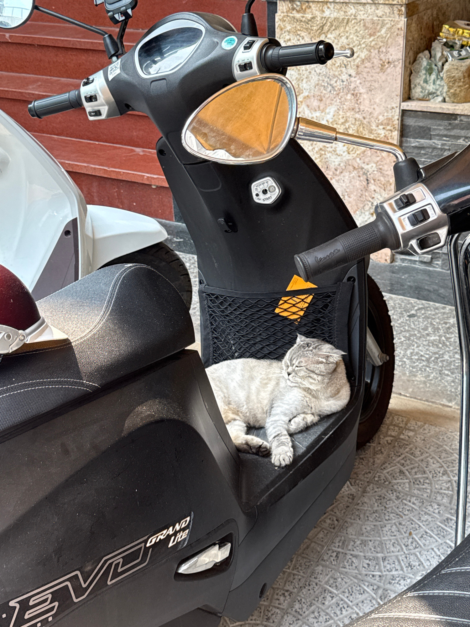 A grey tabby cat is sleeping in the front storage pocket of a black scooter, parked on a textured surface. The scooter has a speedometer, mirror, and handlebars, along with a netted storage area. Part…read more