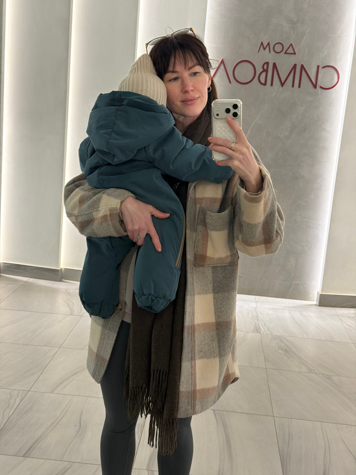 A woman holds a bundled child in a selfie pose in front of a wall bearing the inscription "CNMBPOV" which has been identified as a shopping mall in Perm, Russia. The woman is wearing glasses and a che…read more