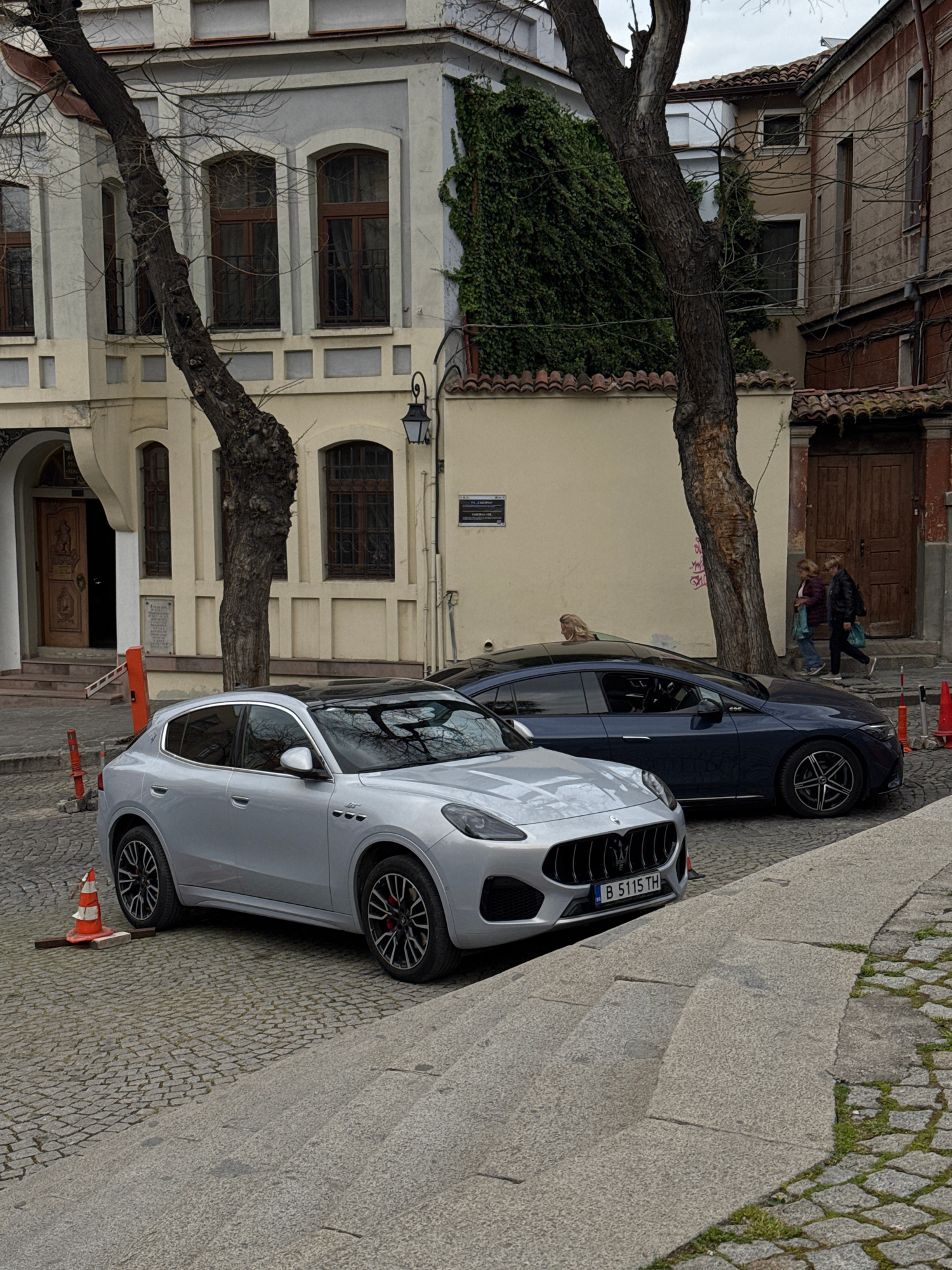 This street-level photograph captures a historical street scene in Plovdiv, Bulgaria, under an overcast sky. The perspective is slightly elevated, looking down a narrow cobblestone street lined with t…read more