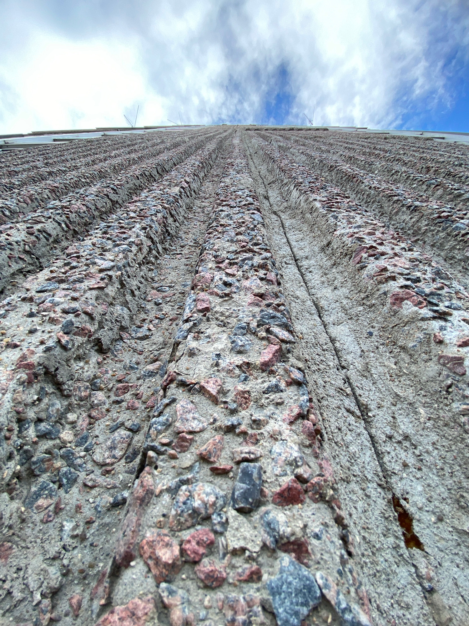 An upward-angled shot captures the textured facade of a tall building against a partially cloudy, blue sky. The building's wall, which dominates the right side of the frame, is constructed from expose…read more