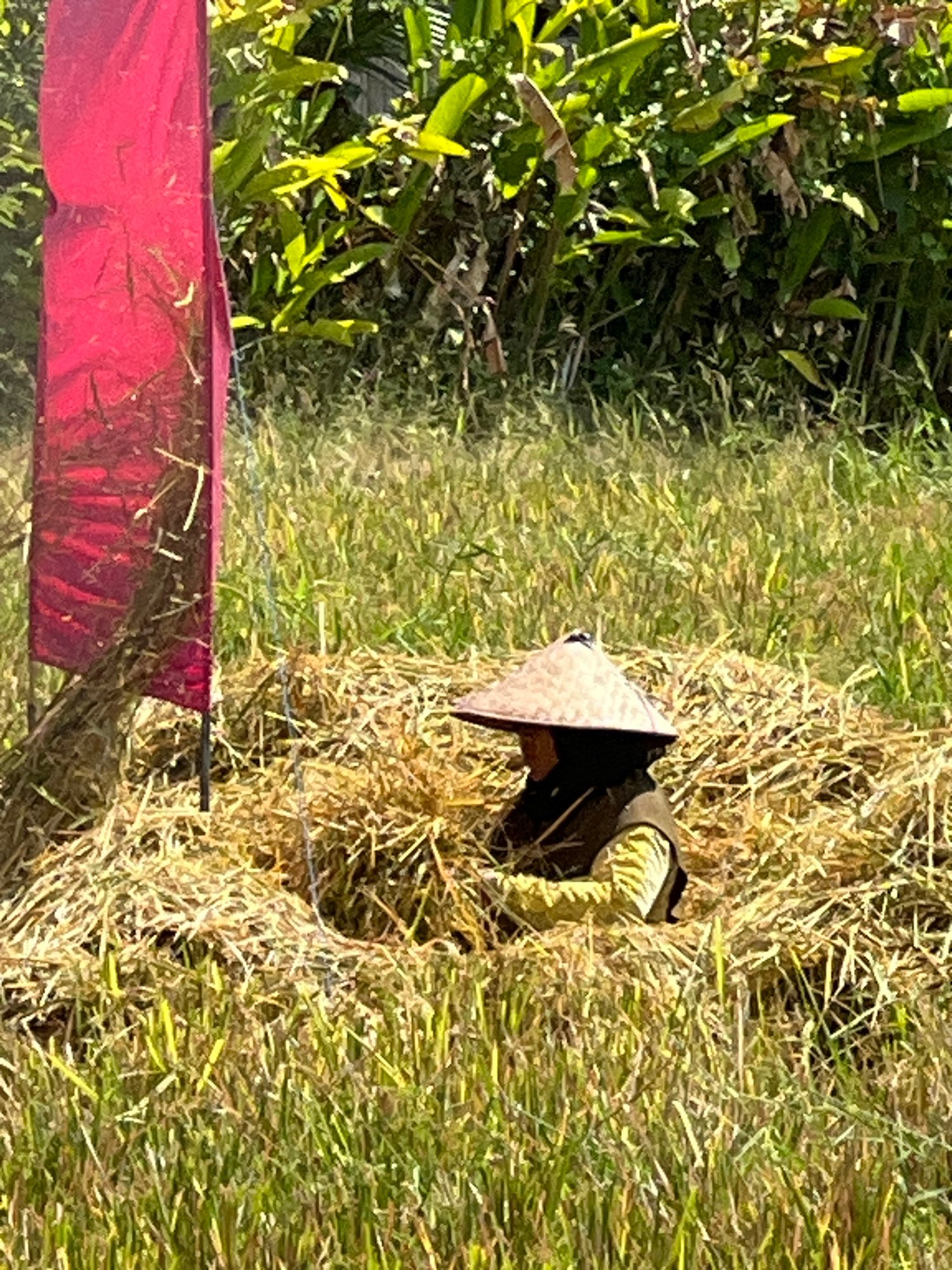 The image depicts a rural scene in North Kuta, Indonesia. A field of mixed green and dried grasses occupies the majority of the frame. In the center of the field, there is a constructed animal trap. T…read more