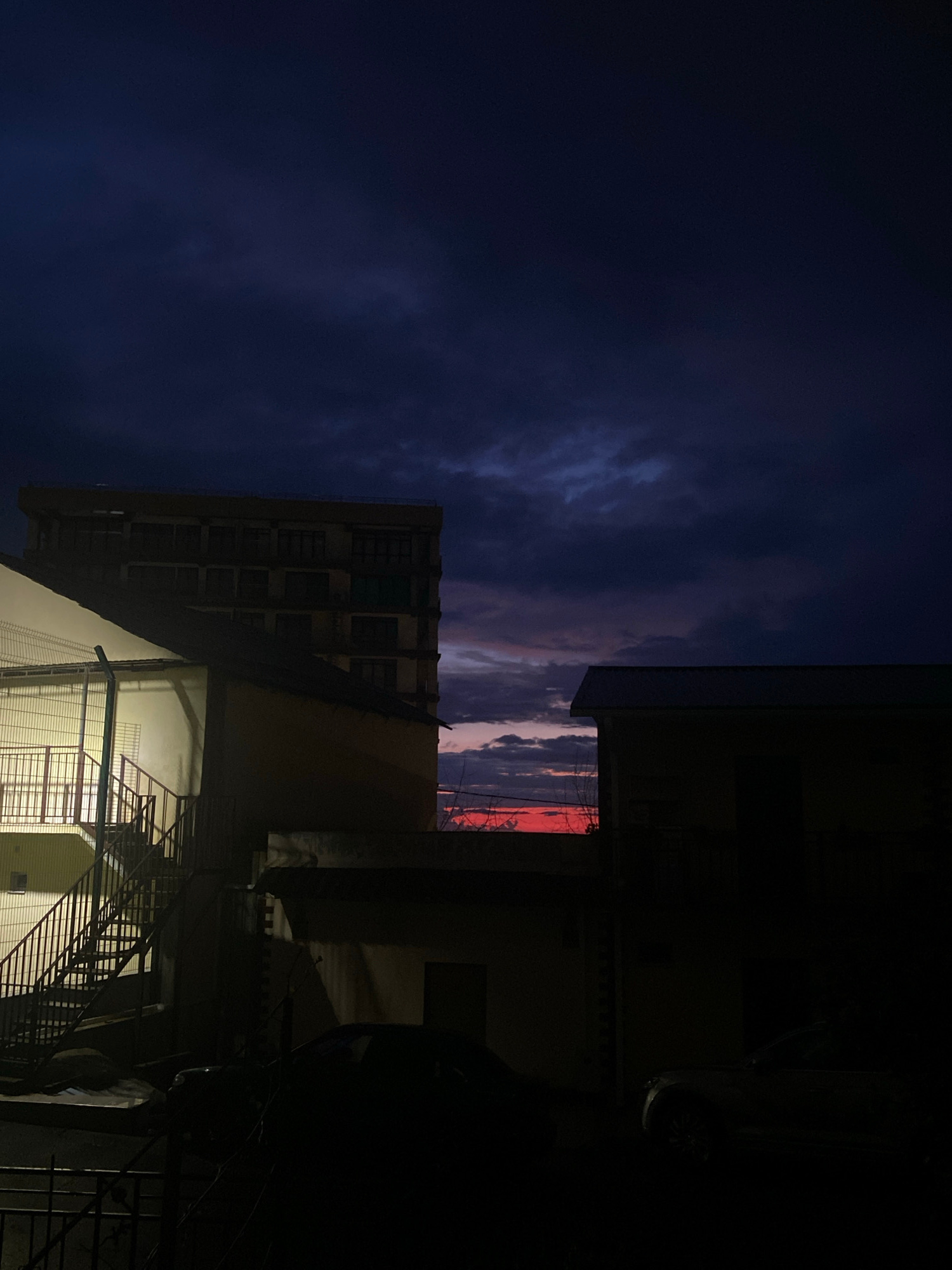 The image is an upward view of buildings at dusk or night. A dark blue sky fills the left side of the frame, with faint clouds visible. Buildings occupy the right side of the image, appearing mostly s…read more