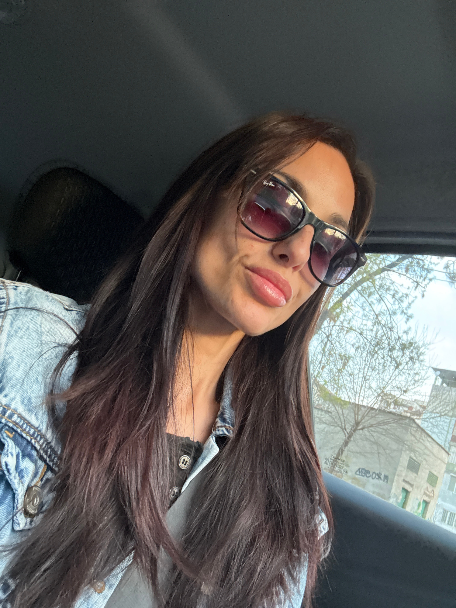 The image is a selfie of a woman with long brown hair, wearing sunglasses and a denim jacket. She is likely in a car, as suggested by the interior view and the window behind her. Through the window, a…read more