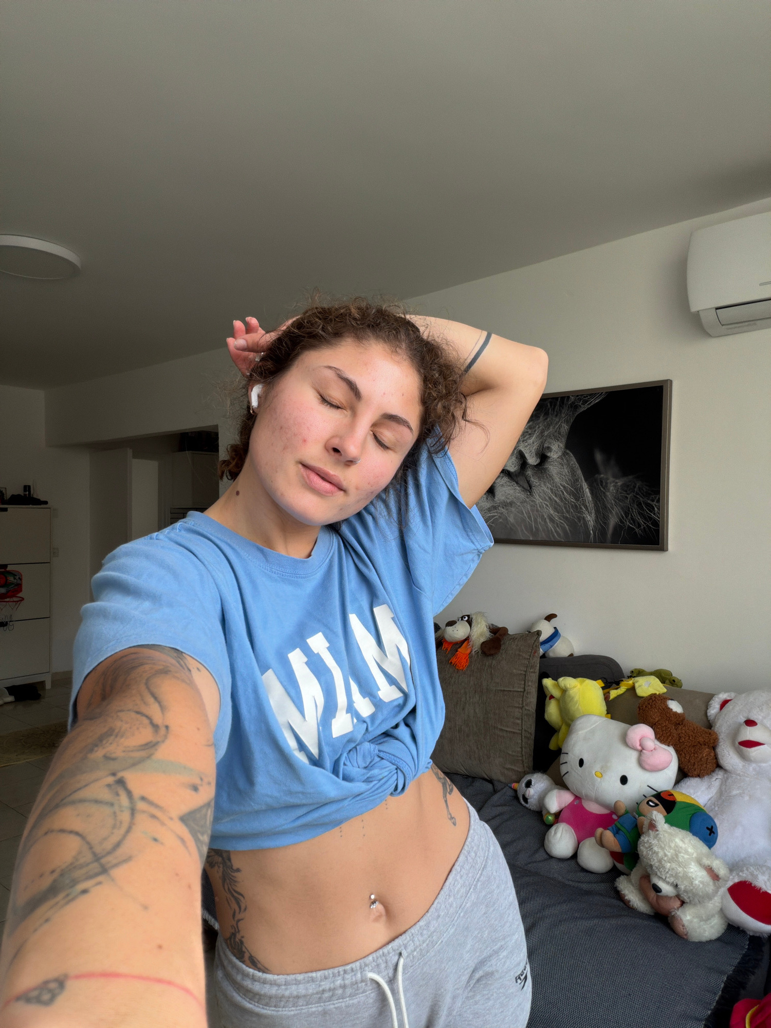 A woman with curly brown hair is lying on a gray couch with a pile of stuffed animals. She is wearing a light blue T-shirt and gray shorts. She has tattoos on her arms and stomach. There is a black an…read more