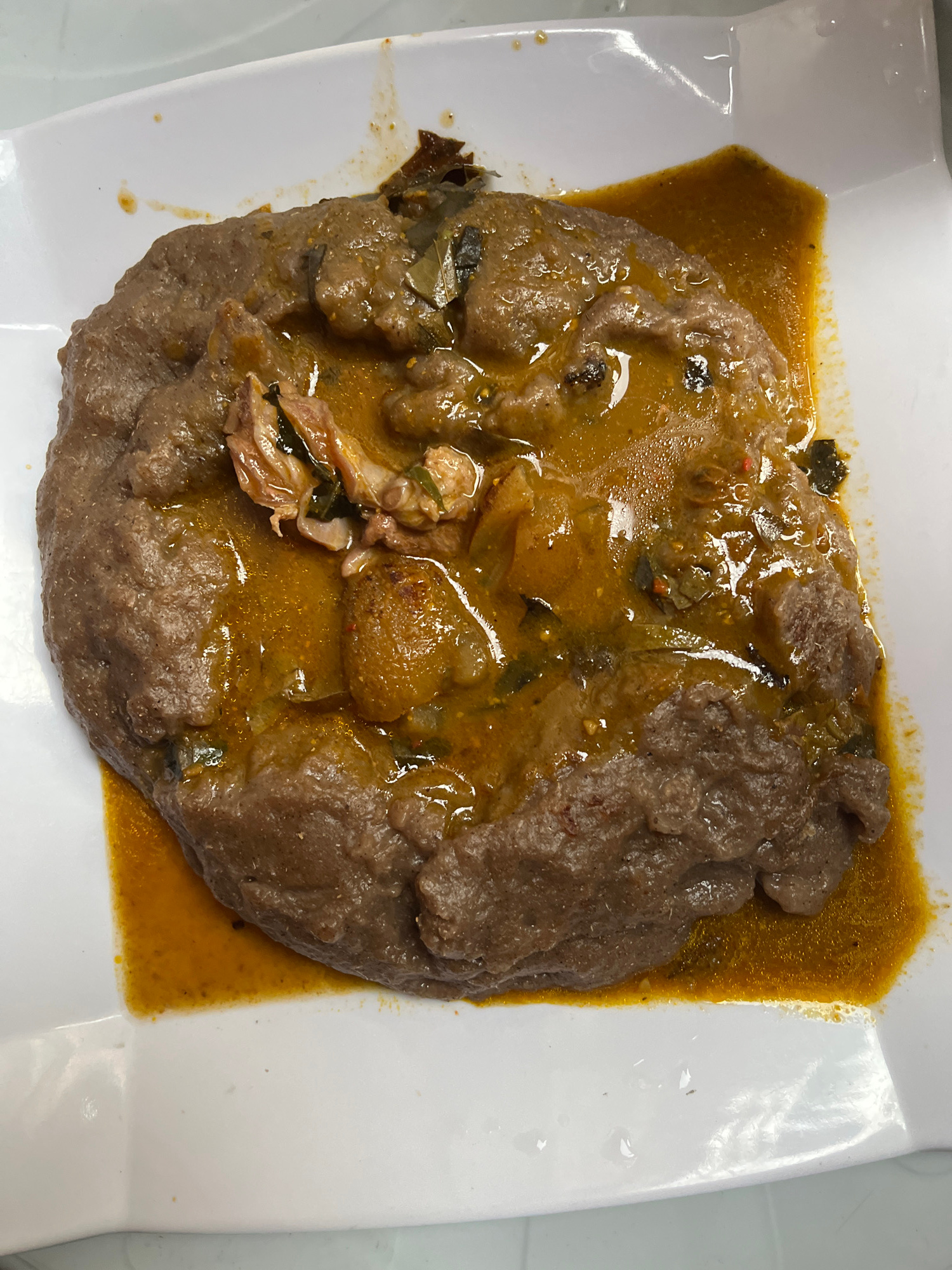 An overhead shot presents a hearty meal served on a pristine white, rectangular plate with slightly raised edges. The central focus is a large, dark-brown, dense mound of a starchy staple food, charac…read more