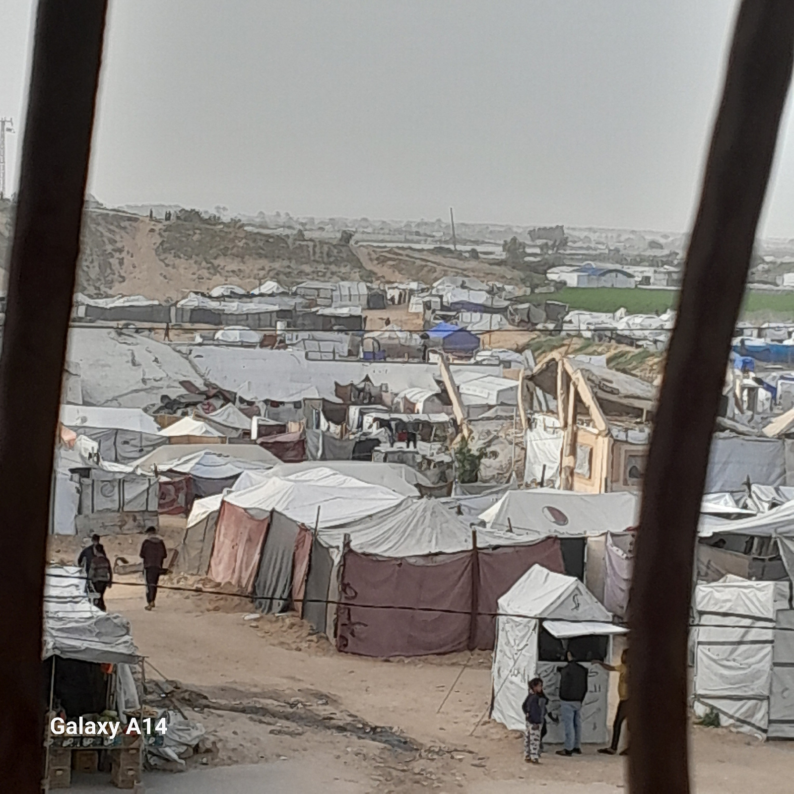 An aerial shot depicts a refugee camp in Khan Yunis, Palestinian Territory. Numerous tents and temporary shelters spread across a dusty landscape. People are visible moving within the camp. The enviro…read more