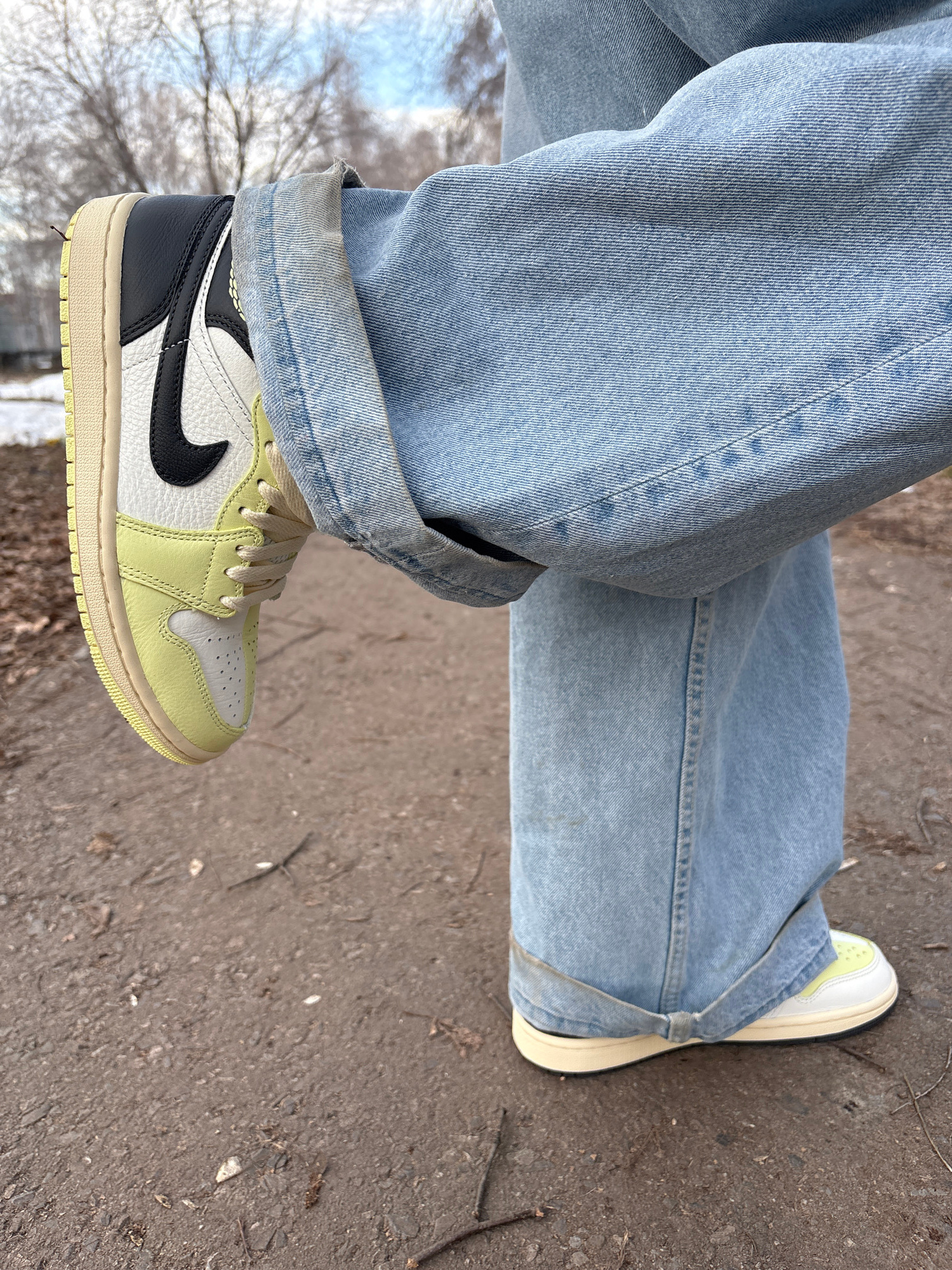The image shows a person wearing light blue jeans and sneakers, standing on what appears to be a paved surface or possibly a dirt path. The sneakers are predominantly white and light green, with a bla…read more