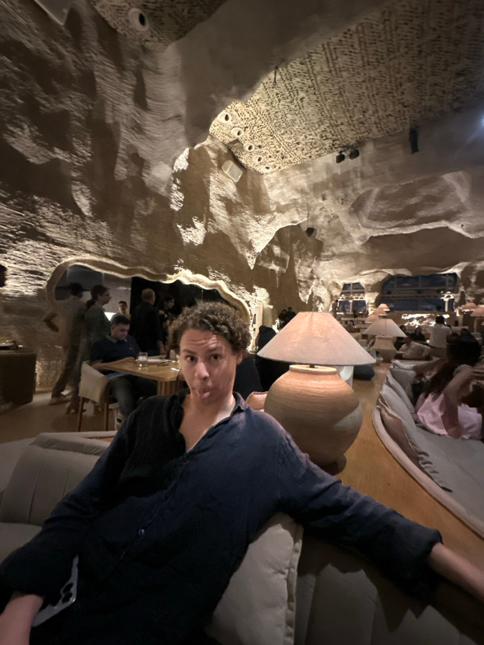 The image depicts the interior of Opa Kipos, located at The Mills, Lower Parel, Mumbai, India. A young individual with dark, curly hair, wearing a dark blue long-sleeved shirt, sits angled on a light…read more