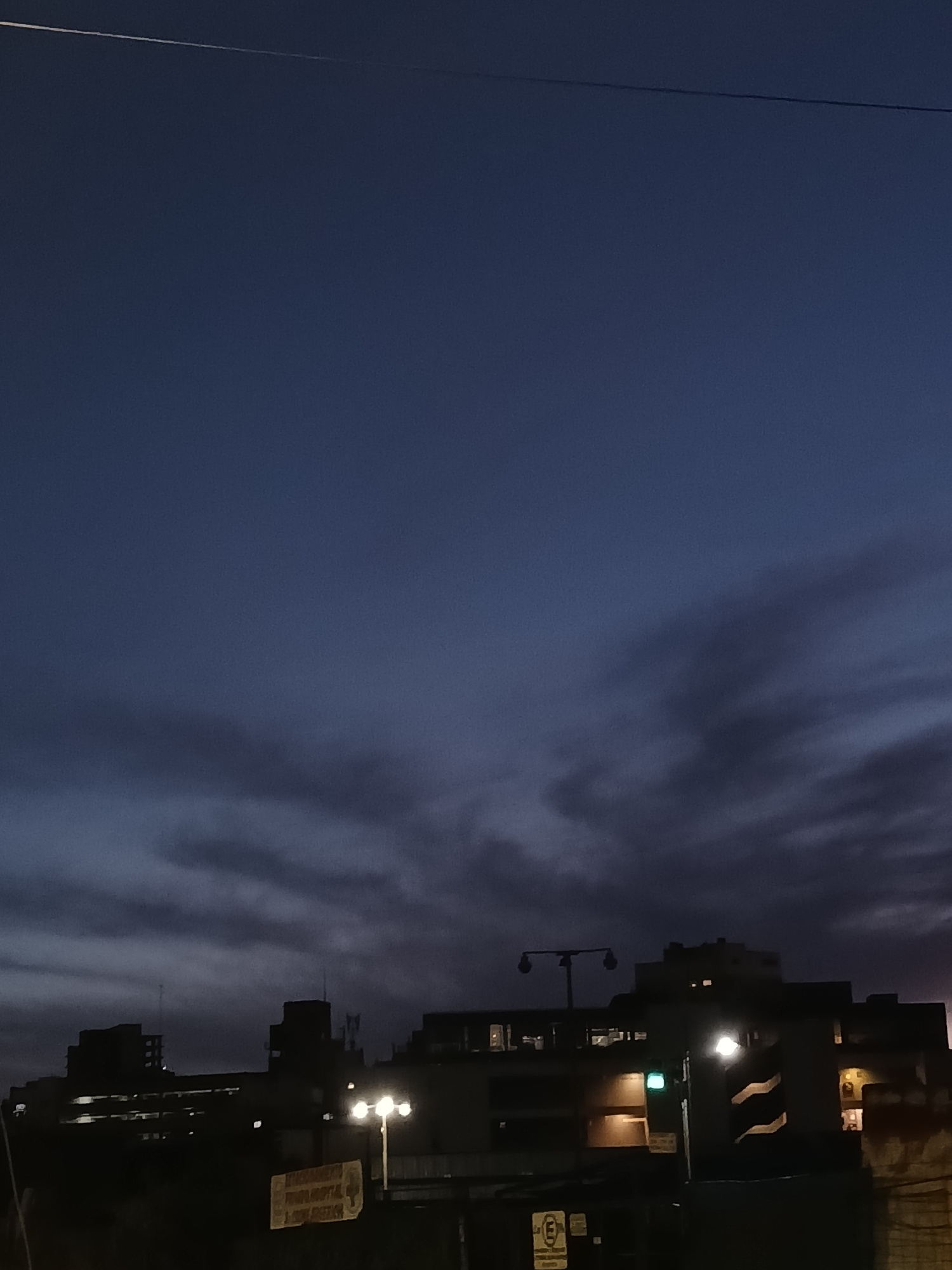 The image captures a nighttime scene in Buenos Aires, Argentina. The right side of the frame shows a dark urban environment, with buildings, streetlights, and signs silhouetted against the dusky sky.…read more