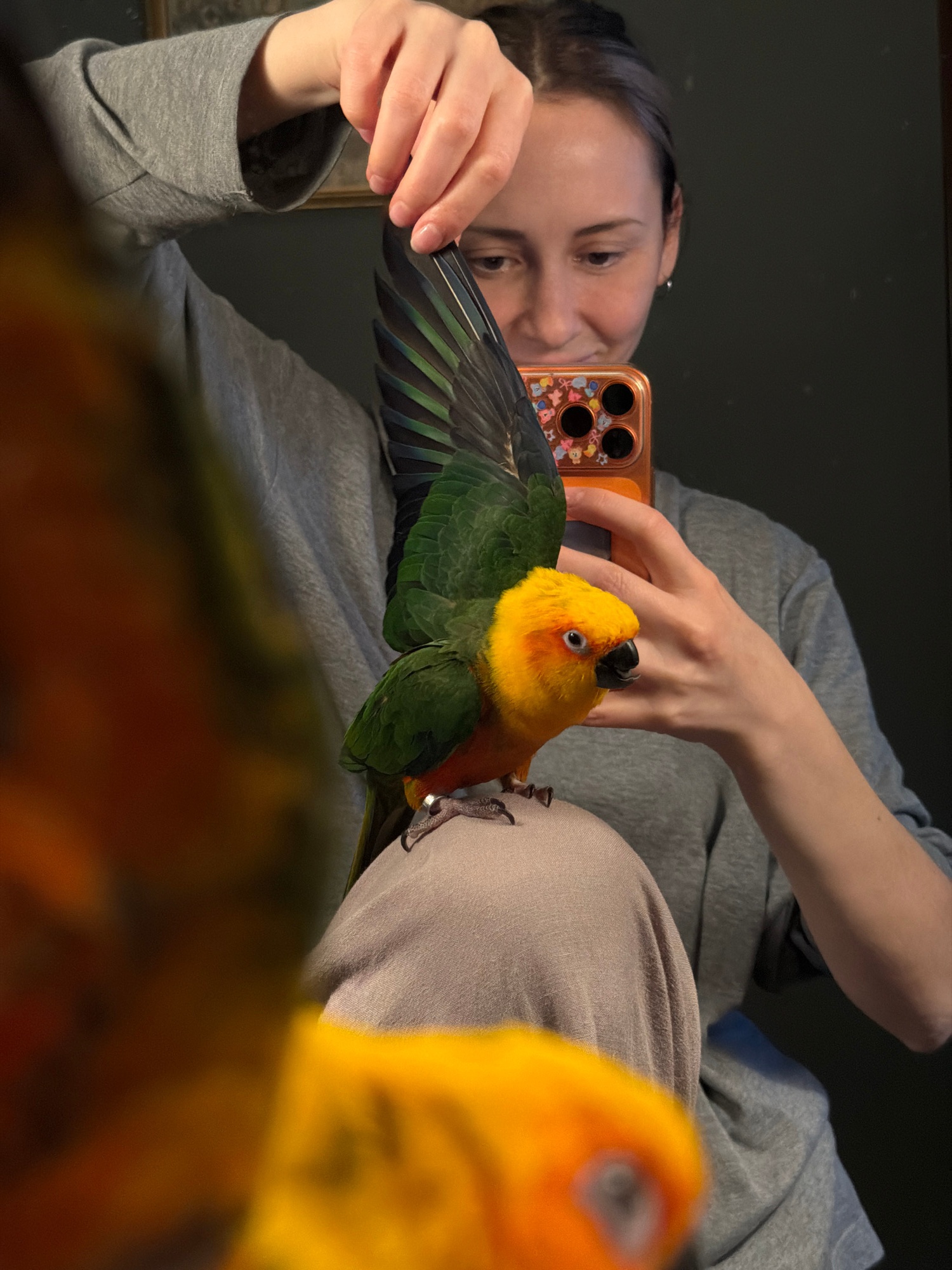 A woman is shown in an eye-level, horizontally oriented selfie, holding a green and yellow Sun Conure parrot with outstretched wings, seemingly admiring it. The woman holds a phone with a light-coloreβ¦read more