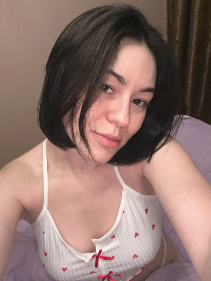 A woman with short, dark hair lies on a purple surface, facing the camera. She wears a white top decorated with small red hearts and a red ribbon accent. Her expression is serene, and her skin appears…read more