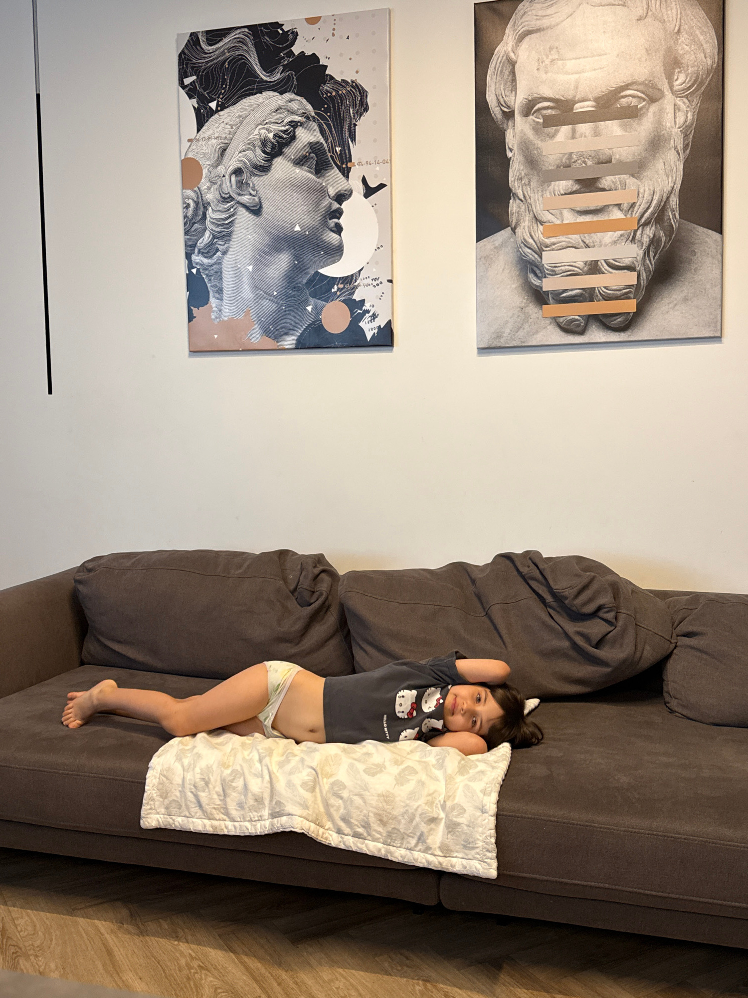 A young girl is lying on a brown couch with a pillow behind her head. She is wearing a gray shirt with cartoon characters and white underwear. Her hands are behind her head. Two framed pieces of art a…read more