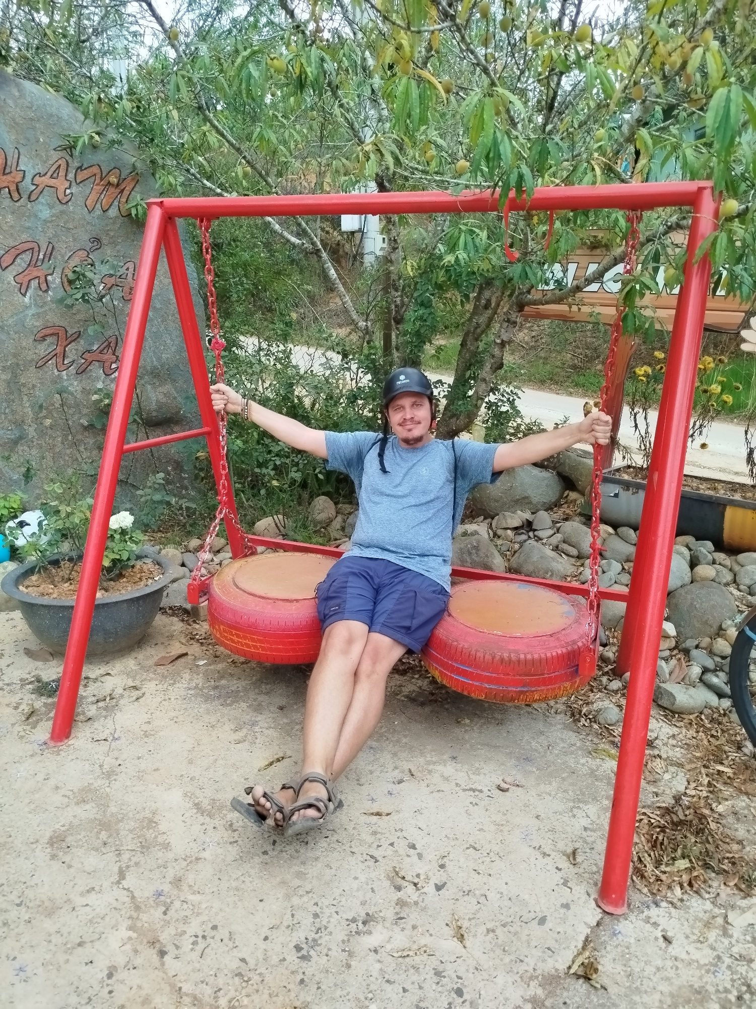 In Đa Thọ, Vietnam, a man is seated on a tire swing within a park-like setting. He is wearing a gray shirt, blue shorts, sandals, and a helmet. The swing is painted red, and the seats are made of repu…read more