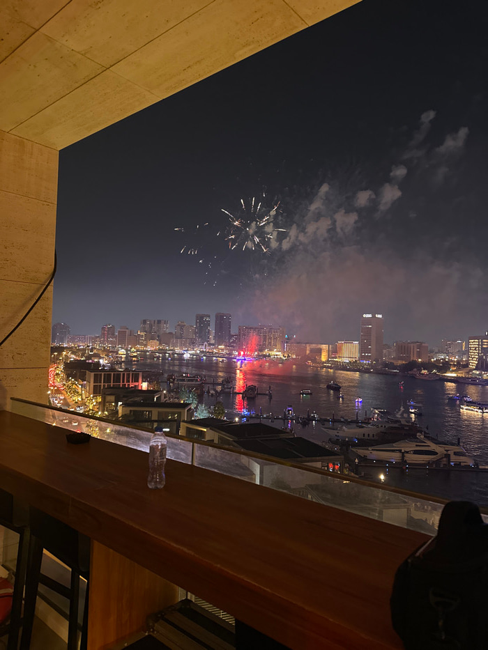 Fireworks explode in the night sky over a cityscape reflected in a waterway. Boats populate the river alongside buildings illuminated with festive lights. The view is from a high vantage point, possib…read more