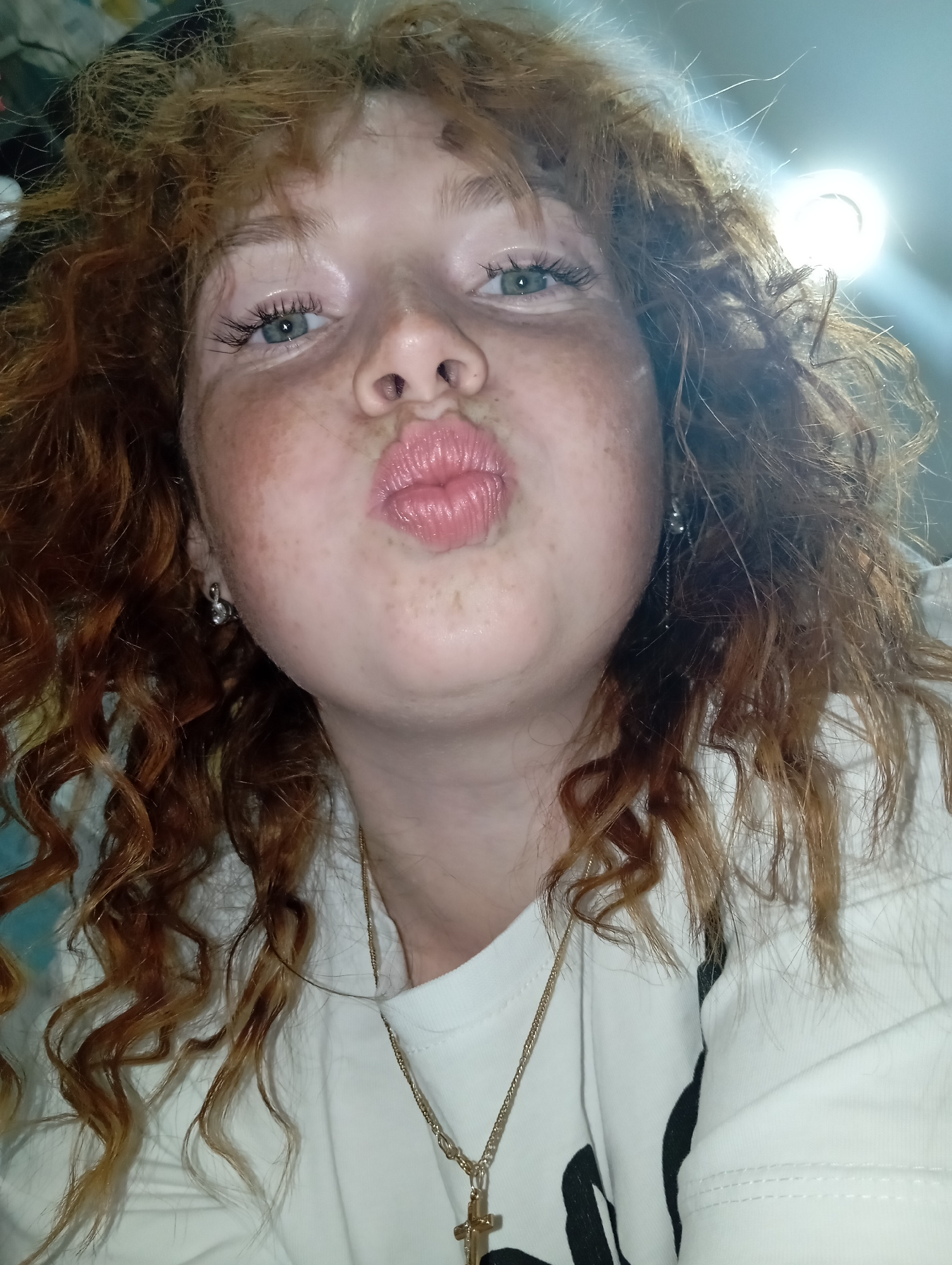 A close-up, rotated photograph depicts a person with fair skin and freckles, possibly female, puckering their lips toward the camera. The individual has light-colored eyes and reddish-brown curly hair…read more