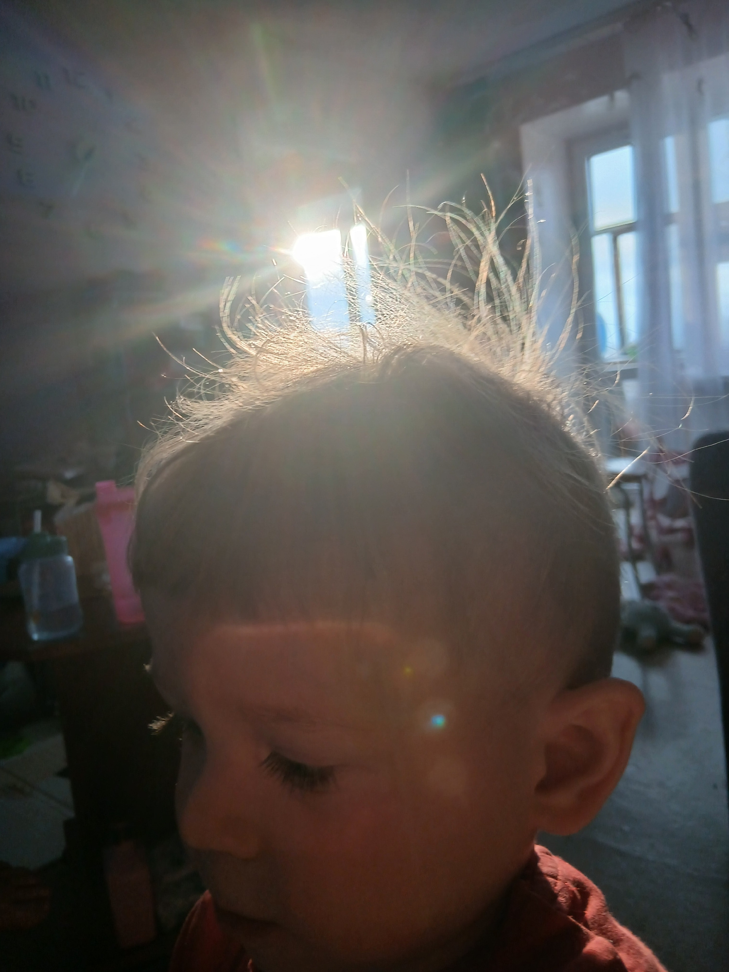 The image depicts a child's face in close-up, seemingly asleep or resting. The child has fair hair, with individual strands highlighted by sunlight. The ear and a portion of the face are visible, alonβ¦read more