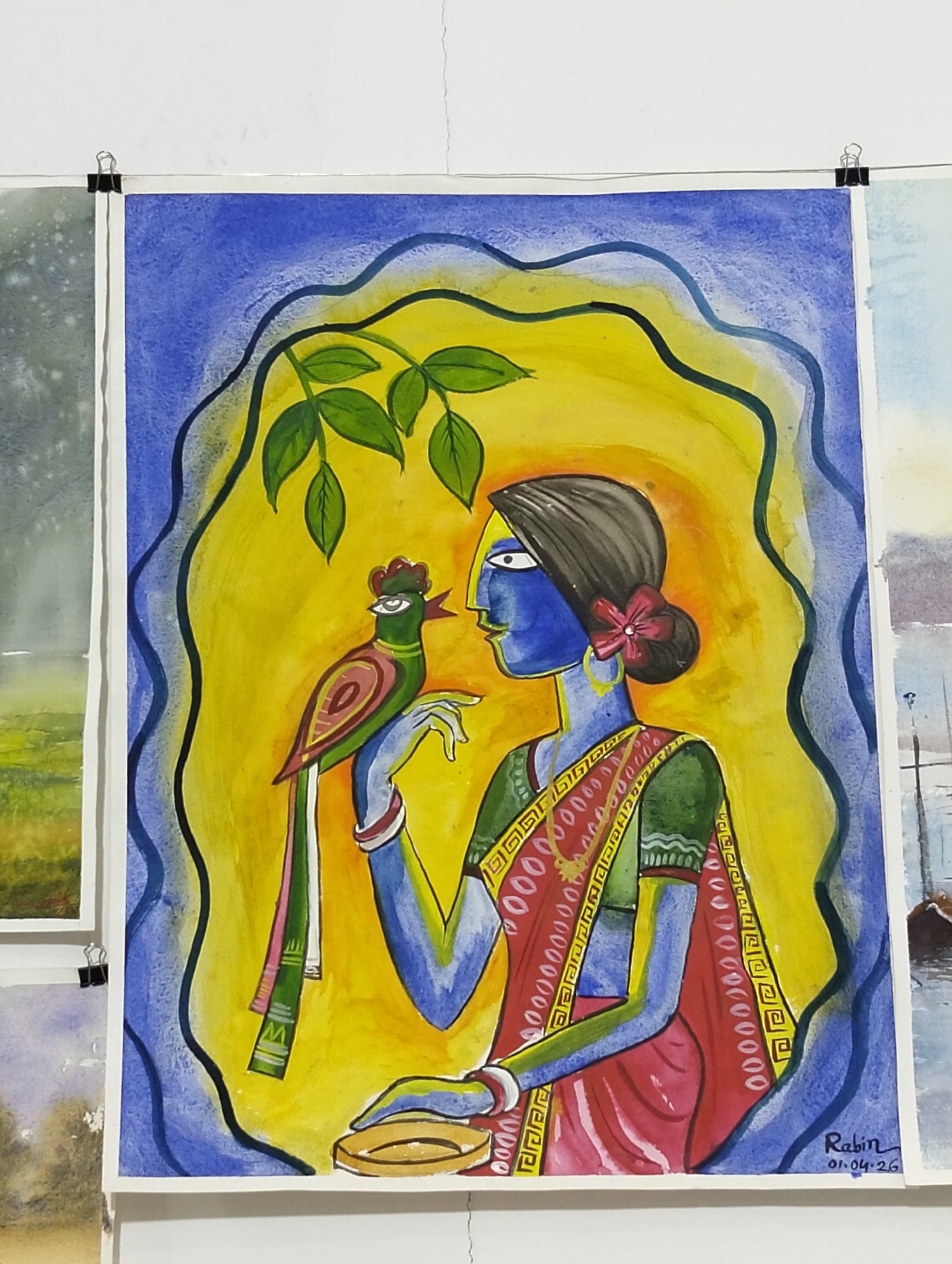 The image shows a painting displayed in a gallery or exhibition space. The painting depicts a woman with blue skin, adorned with a red flower in her dark hair, wearing a green and red sari. She is sea…read more