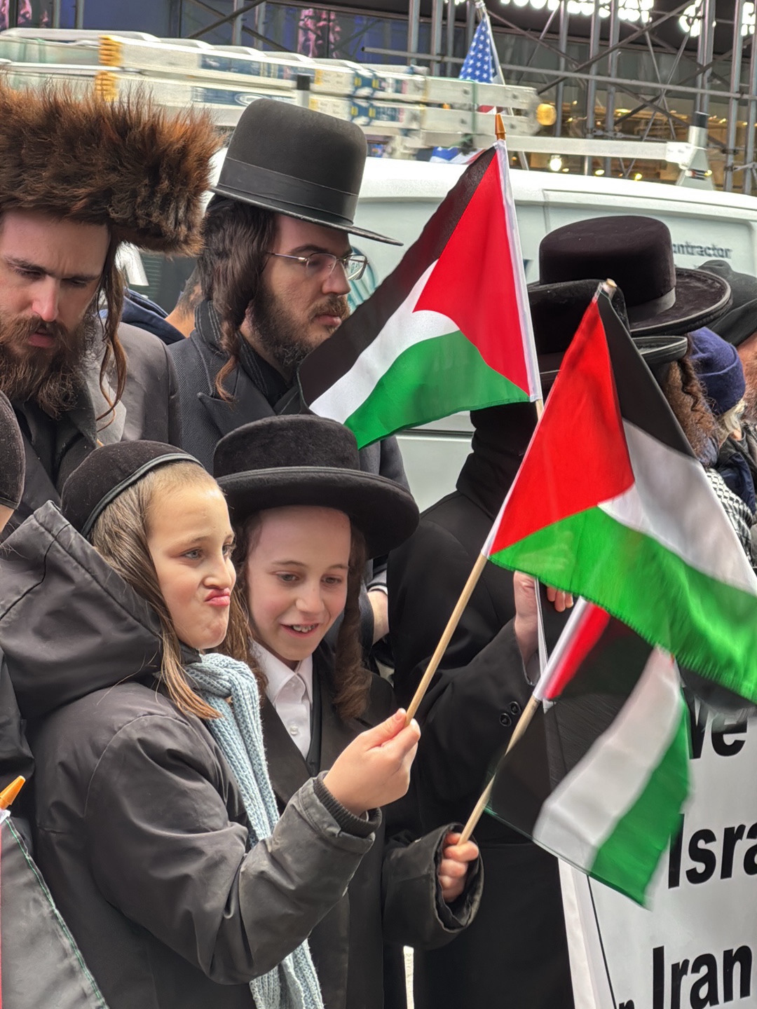 The image captures a public gathering in an urban setting, identified as New York, United States. Approximately five to seven individuals, including two children, are visible in the foreground and mid…read more