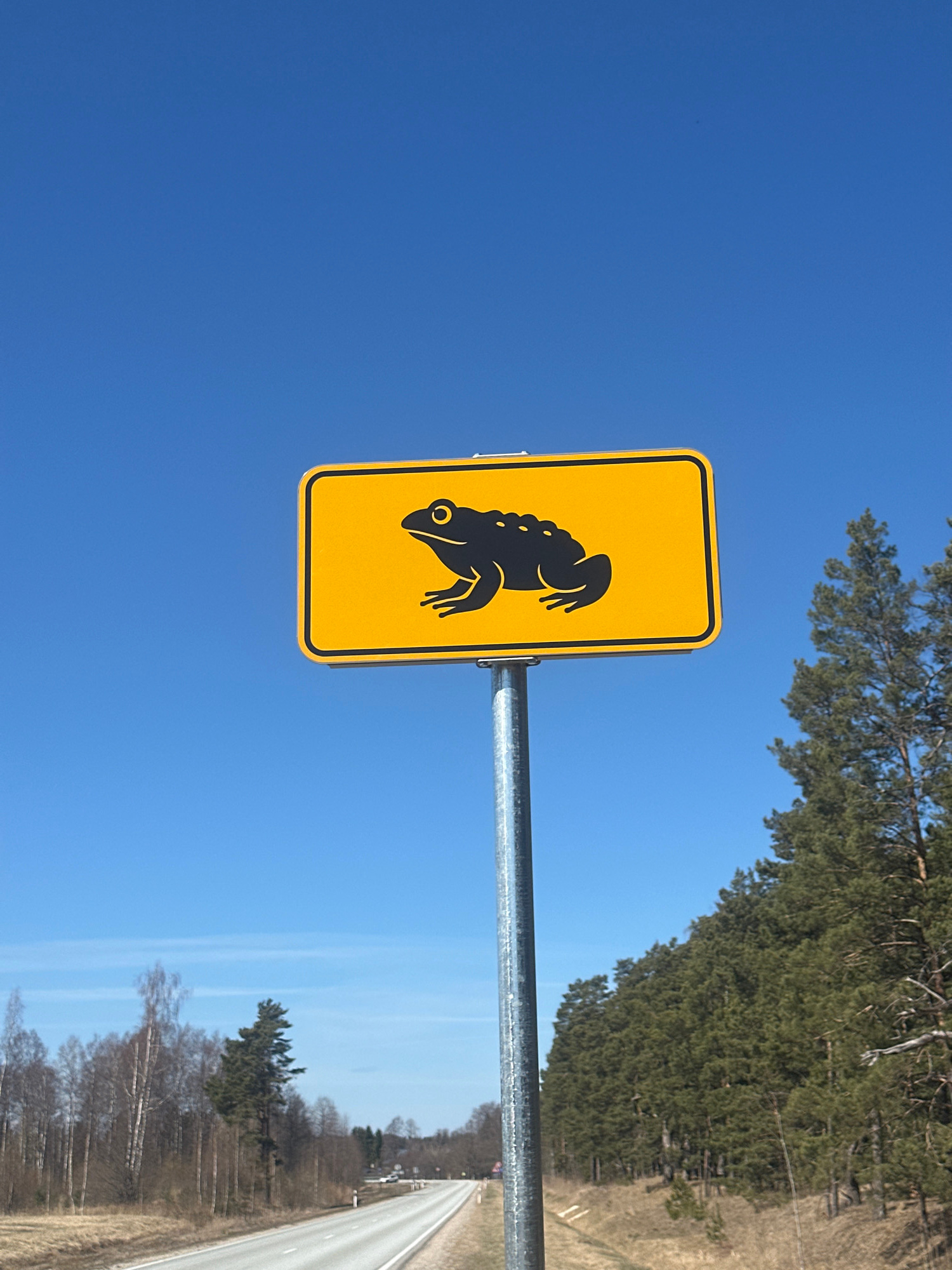 A yellow, rectangular road sign with a black silhouette of a frog is prominently displayed against a clear blue sky. The sign is mounted on a silver metal pole. Behind the sign, the upper portion of a…read more