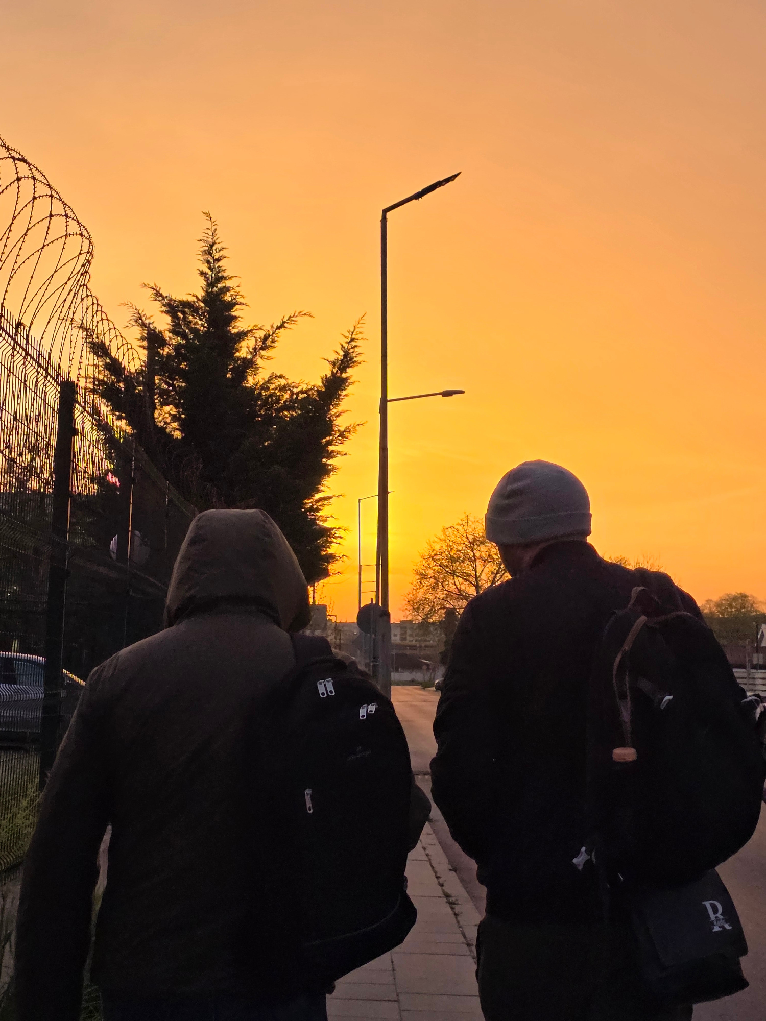 Two people, possibly male, are silhouetted against an orange sky, likely during sunset or sunrise. The individual in the foreground wears a hooded jacket and a backpack. The person behind wears a dark…read more