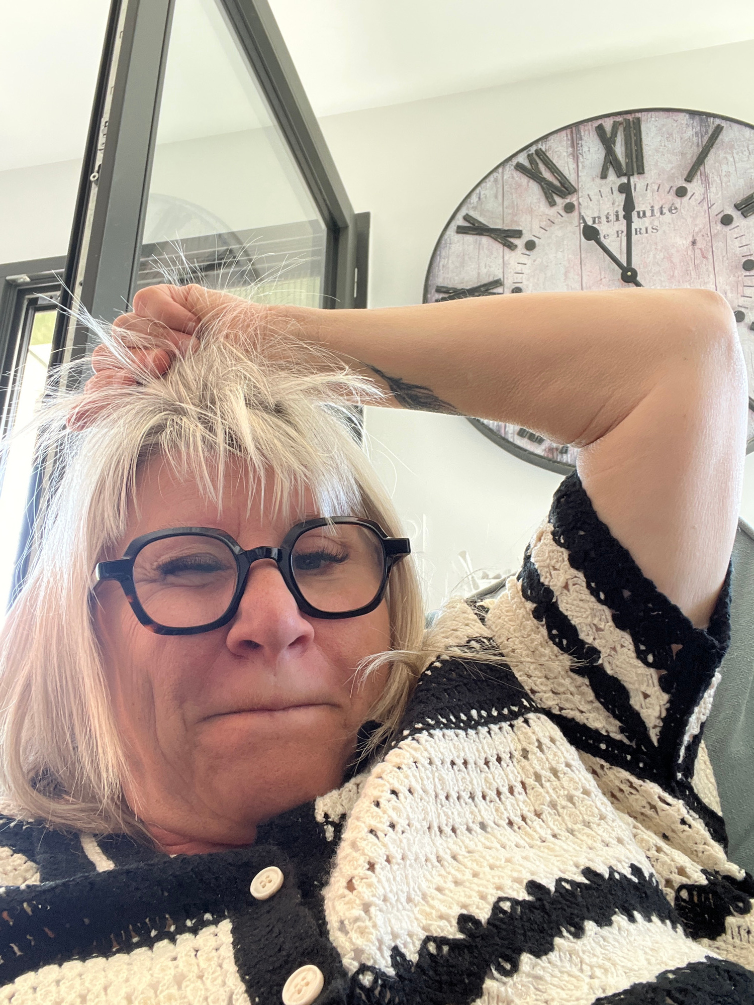 The image presents an overhead or upside-down perspective of a person indoors in Chambœuf, France. The primary subject is a person, likely female, with short, light blonde or white hair, wearing dark-…read more