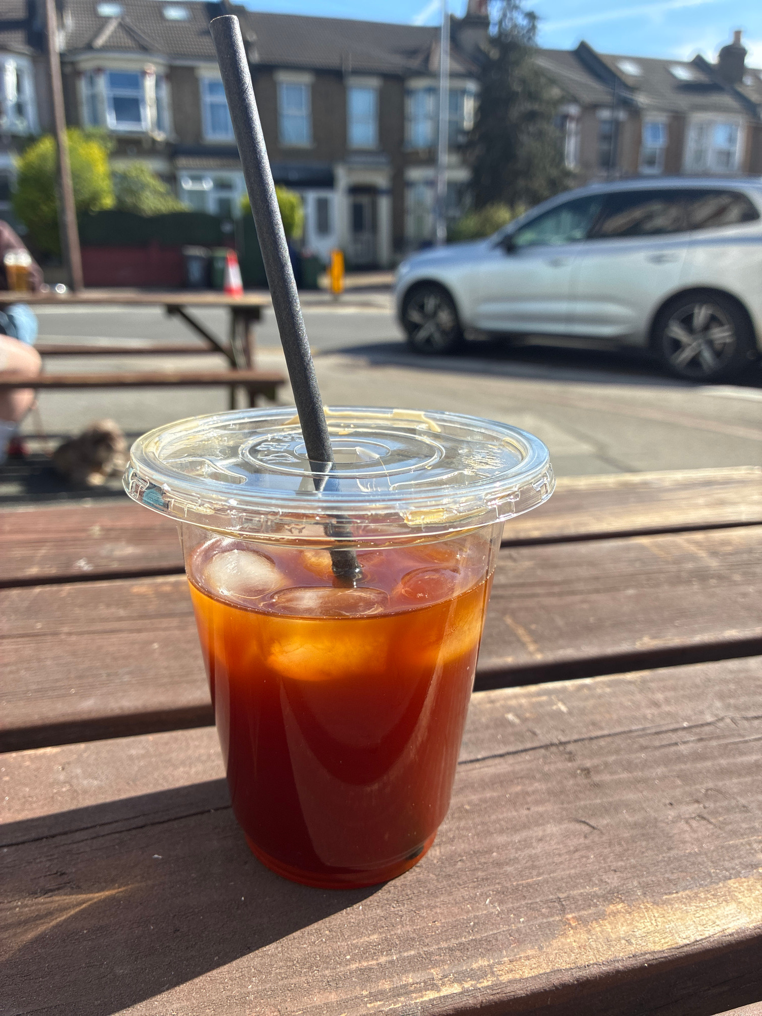 The image shows a plastic cup containing a beverage with ice, resting on a wooden surface. A black straw protrudes from the cup's lid. In the background, blurred buildings, trees, and a white car are…read more