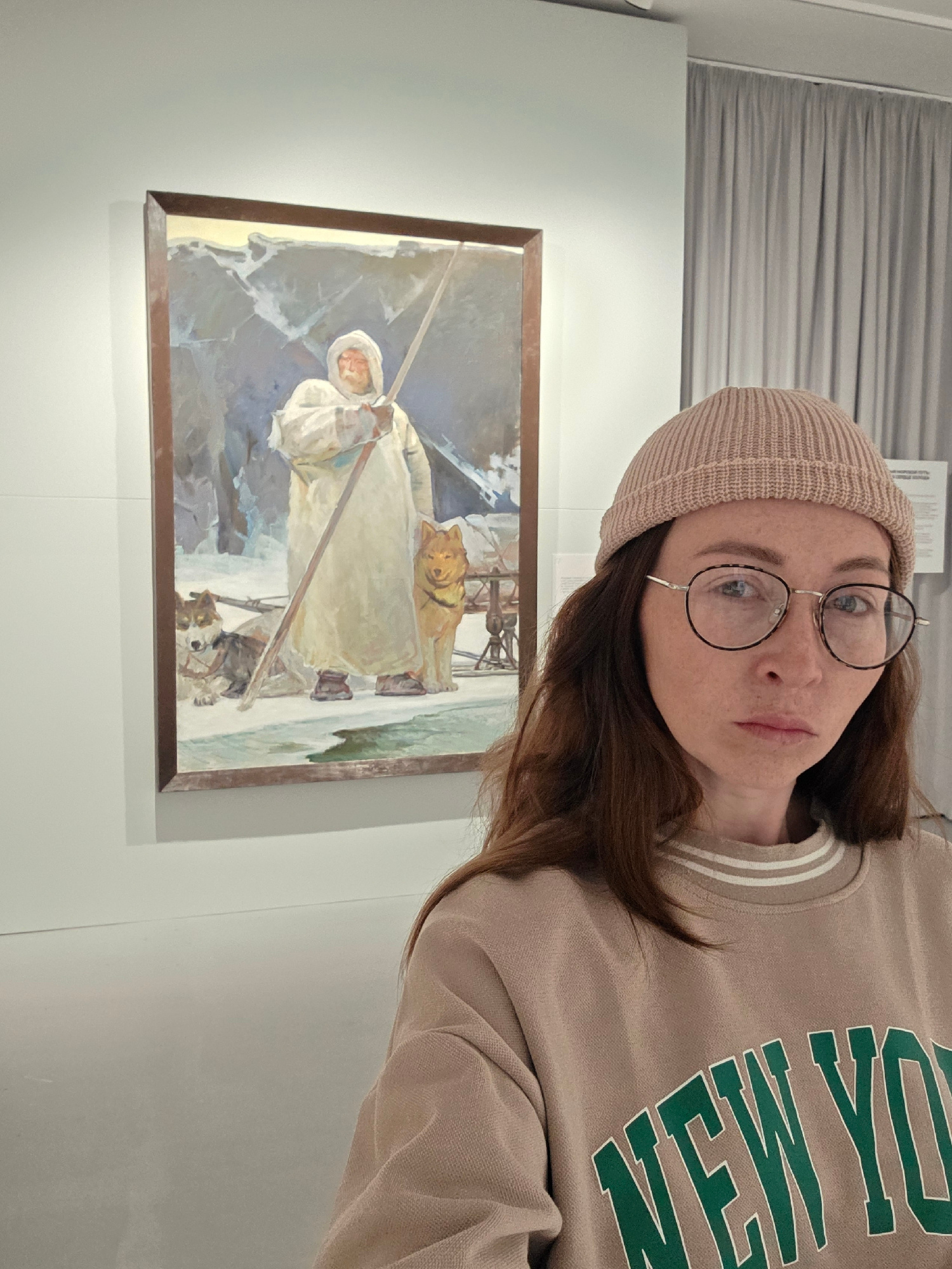 The photograph appears to be a selfie taken inside a gallery or museum in the city of Chaikovsky, Russia. A person with brown hair, wearing a beige sweatshirt with "NEW YORK" written in green letters,…read more