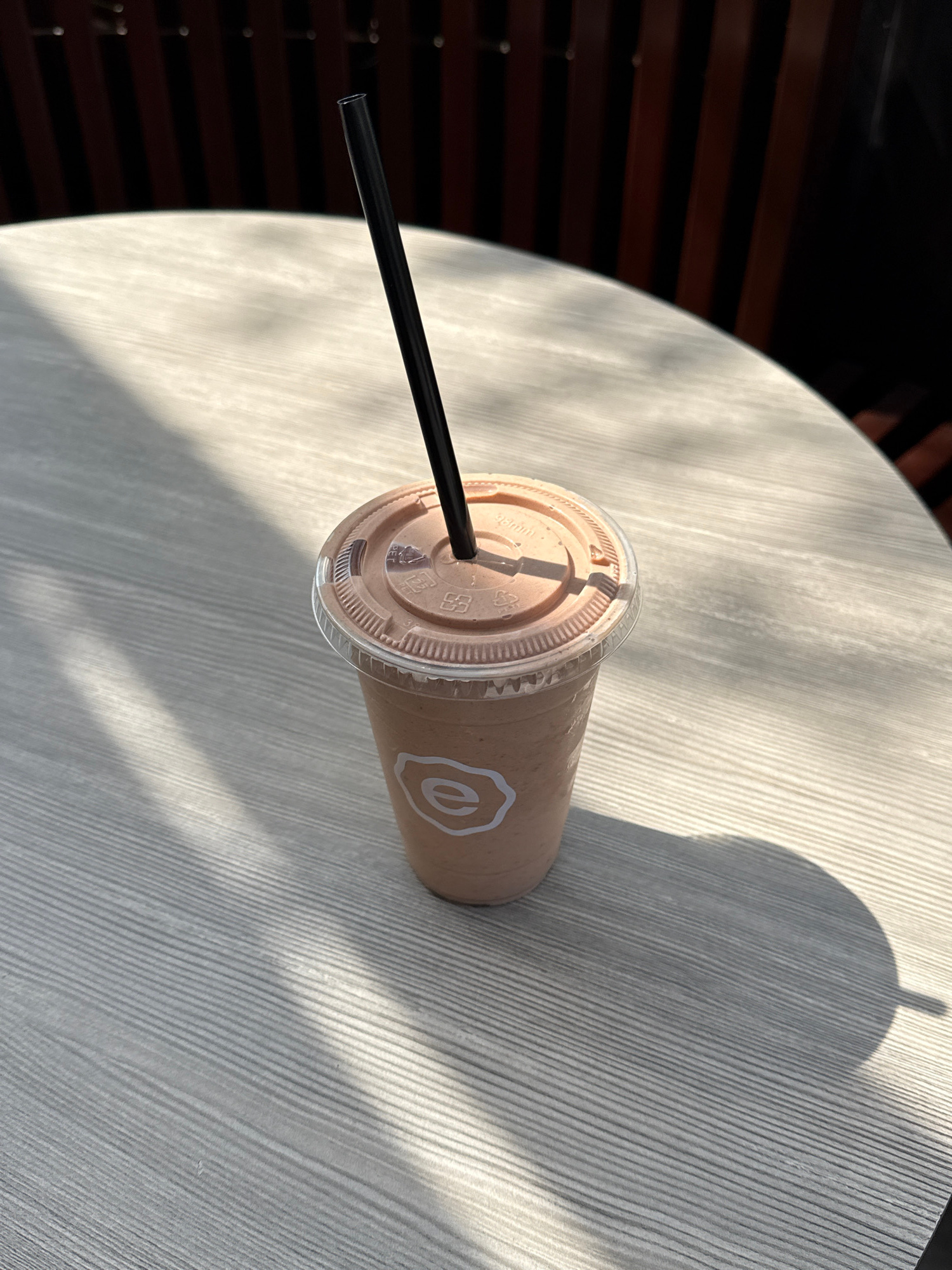 The photograph shows a chocolate milkshake on a light grey round table in West Hollywood, California, USA. The milkshake is in a clear plastic cup with a translucent brown lid and a black straw. The s…read more