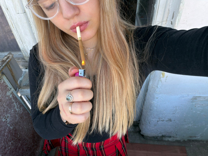 A blonde female, wearing clear-framed eyeglasses, a black long-sleeved top, and a red plaid skirt, is depicted lighting a cigarillo or thin cigar held in her mouth with a pink disposable lighter held…read more
