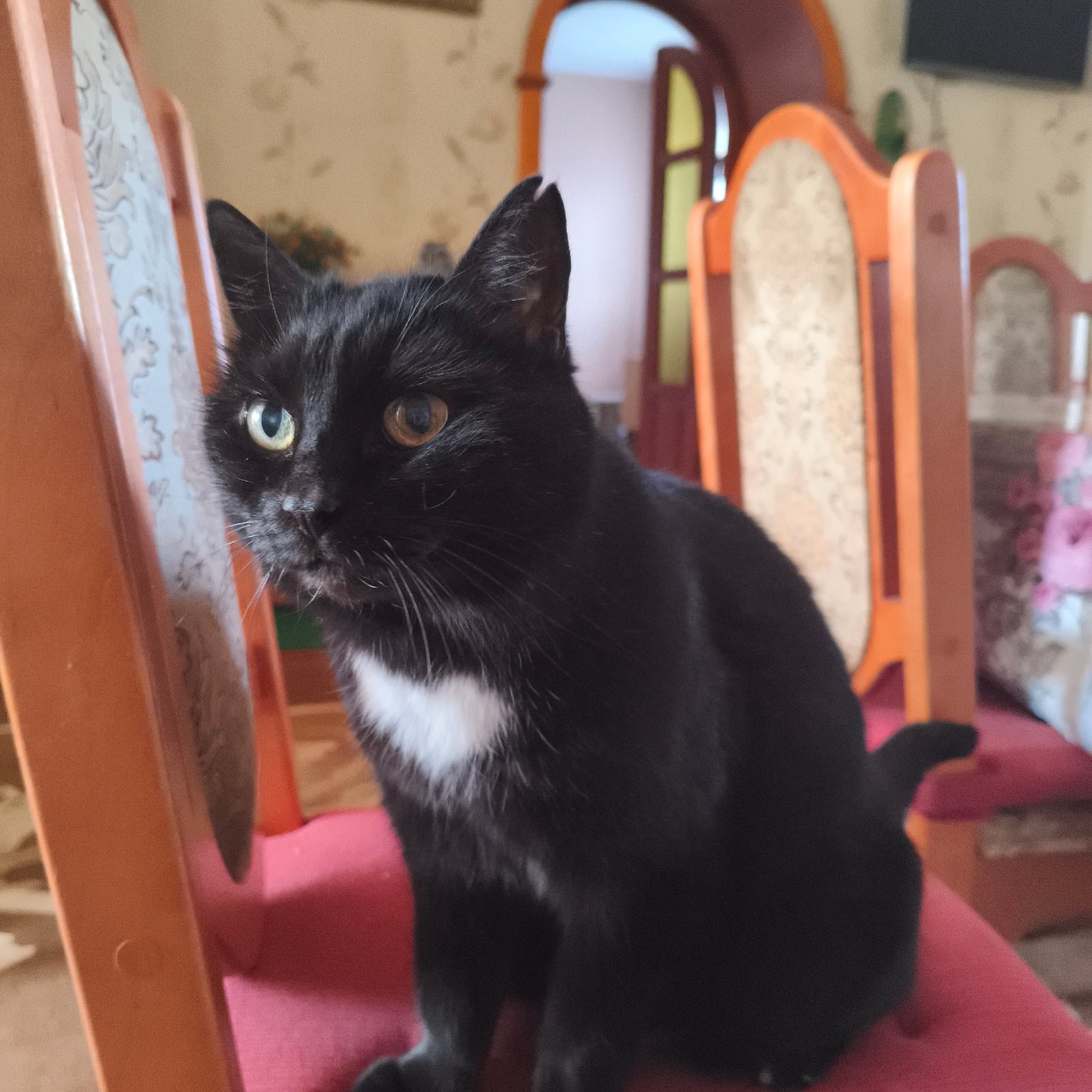 A black cat with distinctive heterochromia is the central subject of the image, sitting on a red-cushioned wooden chair. The cat's left eye (viewer's right) is a greenish-yellow, while its right eye (…read more