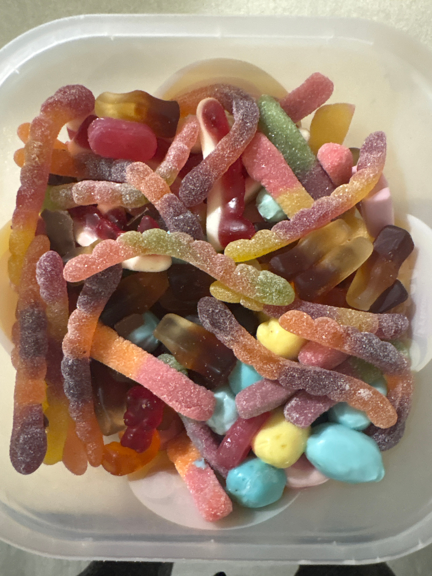A close-up, overhead shot depicts a clear plastic container filled with assorted candies. The container is filled to near capacity, the contents including sour gummy worms, cola bottle-shaped gummies,…read more