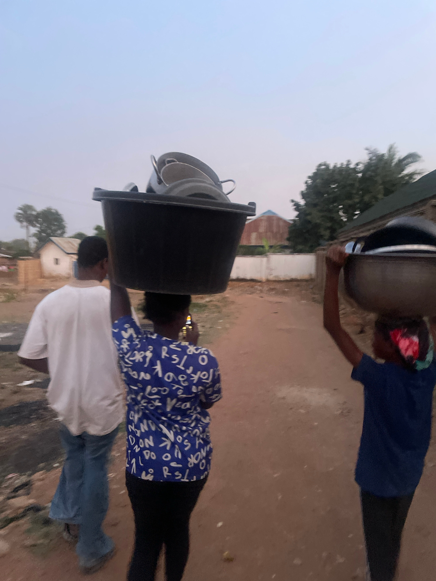 The image depicts three people walking on a dirt path outdoors. One person is wearing a white shirt and blue jeans. A second person is wearing a blue and white patterned shirt and black pants, carryin…read more