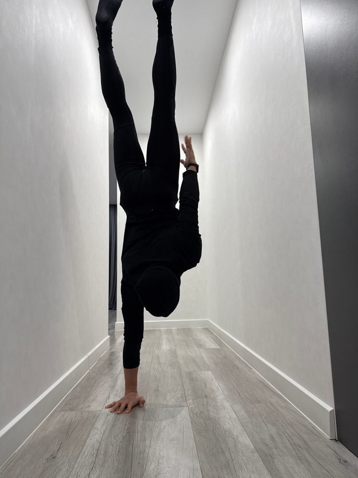 A person dressed in all black presses their hand against a light-colored wood-patterned wall. They are in a room with white walls, light gray floors, and a dark gray ceiling. The person is positioned horizontally in the image, giving the illusion that they are suspended in the air. Their body extends across the frame. One hand is pressed firmly against the wall while the other arm is extended slightly away from the other side of the room. | Open Wire