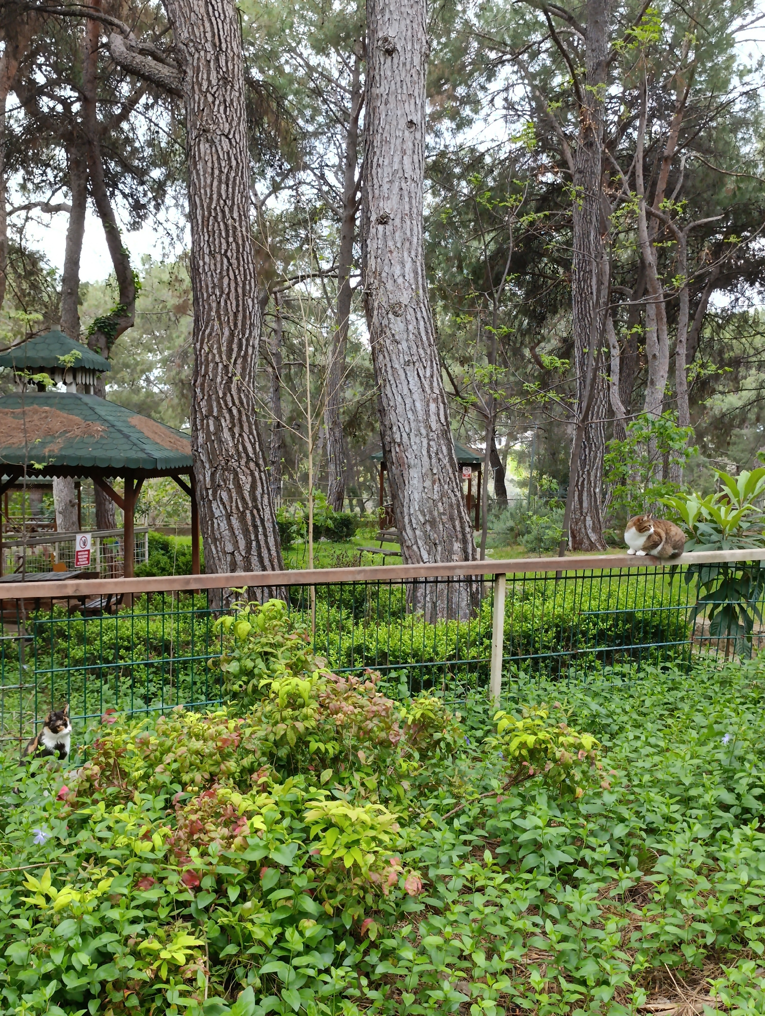 The image depicts a park setting in Kepez, Turkey. Tall pine trees dominate the background. A green-roofed gazebo stands to the left of the frame. A wooden fence with green wire mesh runs horizontally…read more