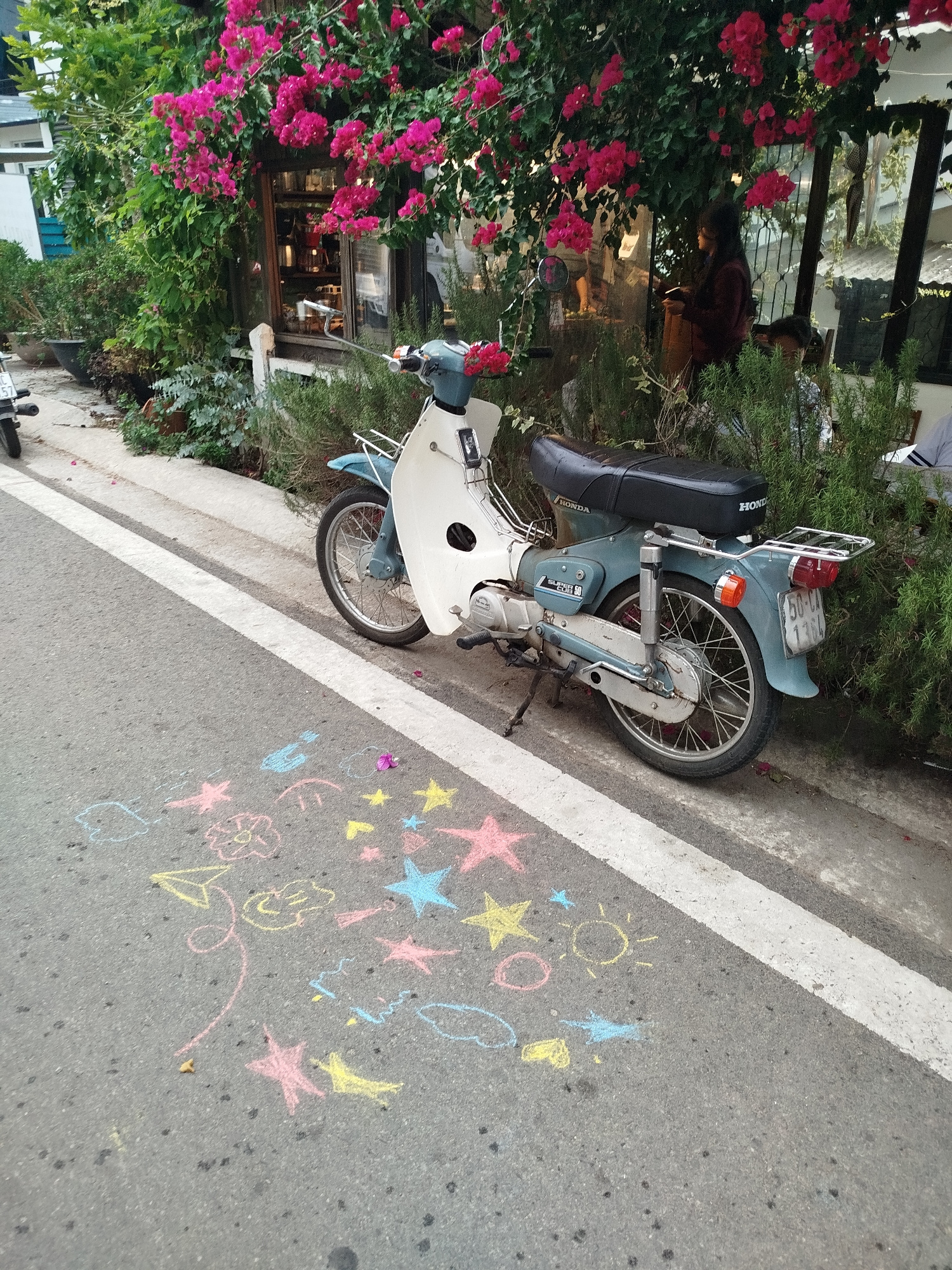 The scene is in Da Lat, Vietnam, featuring a vintage motorcycle parked beside a sidewalk. The motorcycle is light blue and white, bearing the brand "Honda." A chrome luggage rack is attached behind th…read more