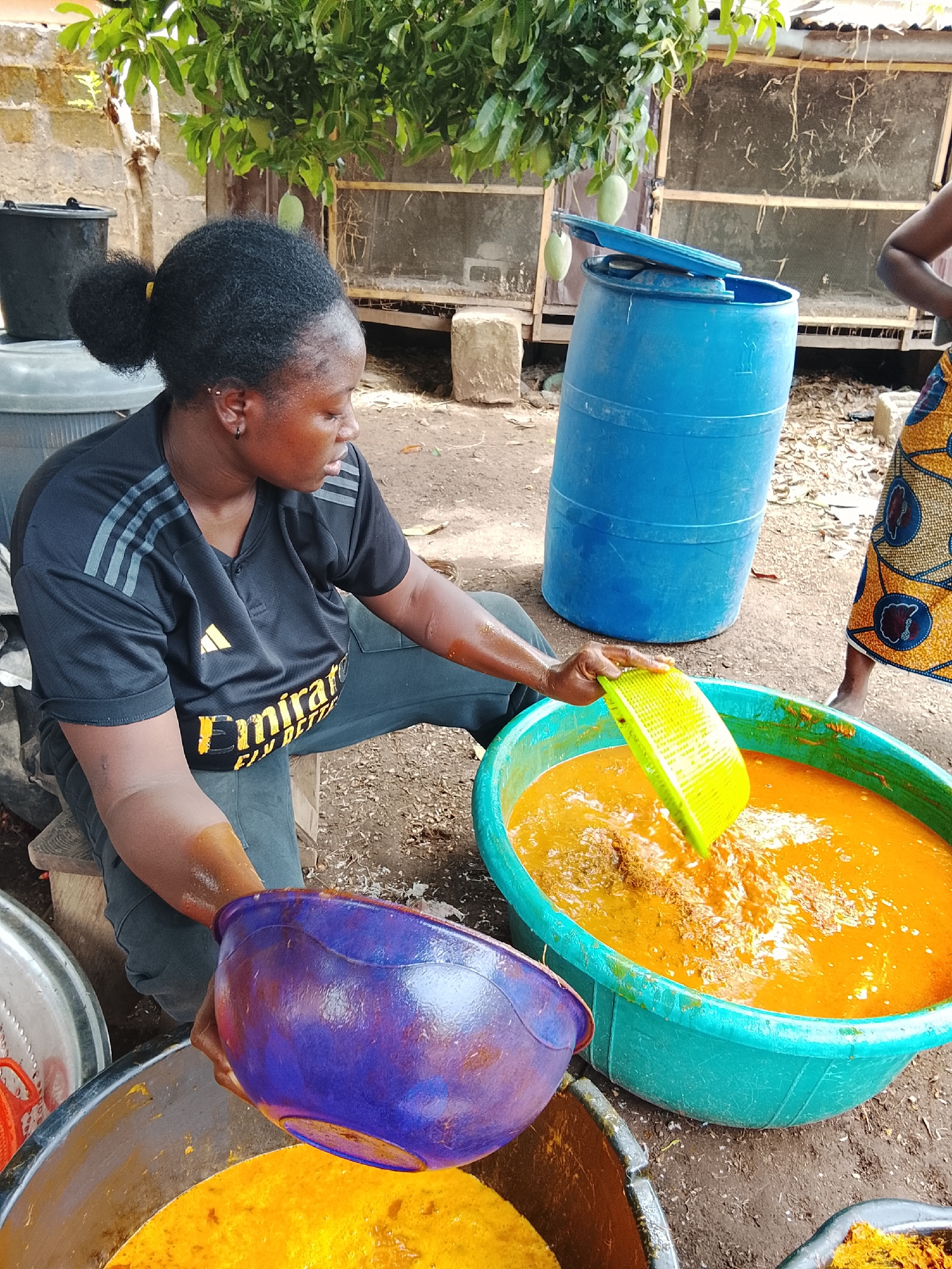 The image depicts a woman in Akwanga, Nigeria, engaged in food preparation outdoors. The woman, wearing a black shirt with a yellow logo and dark pants, is seated on a wooden stool. She is processing…read more