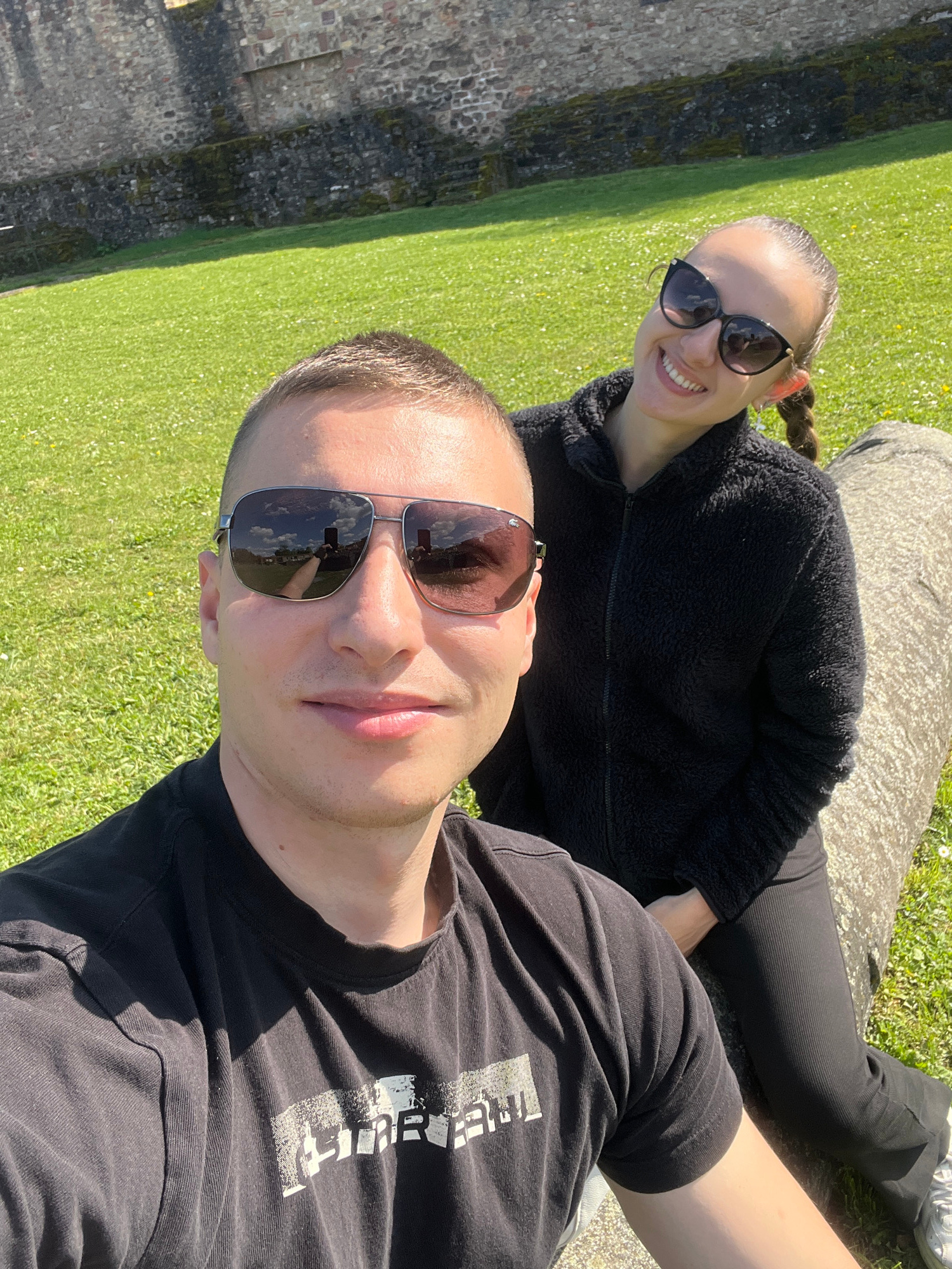 A selfie taken on a sunny day in Trier, Germany, shows two people lying on a grassy lawn. The female is in the background, wearing sunglasses and a black fleece jacket. She has long hair braided into…read more