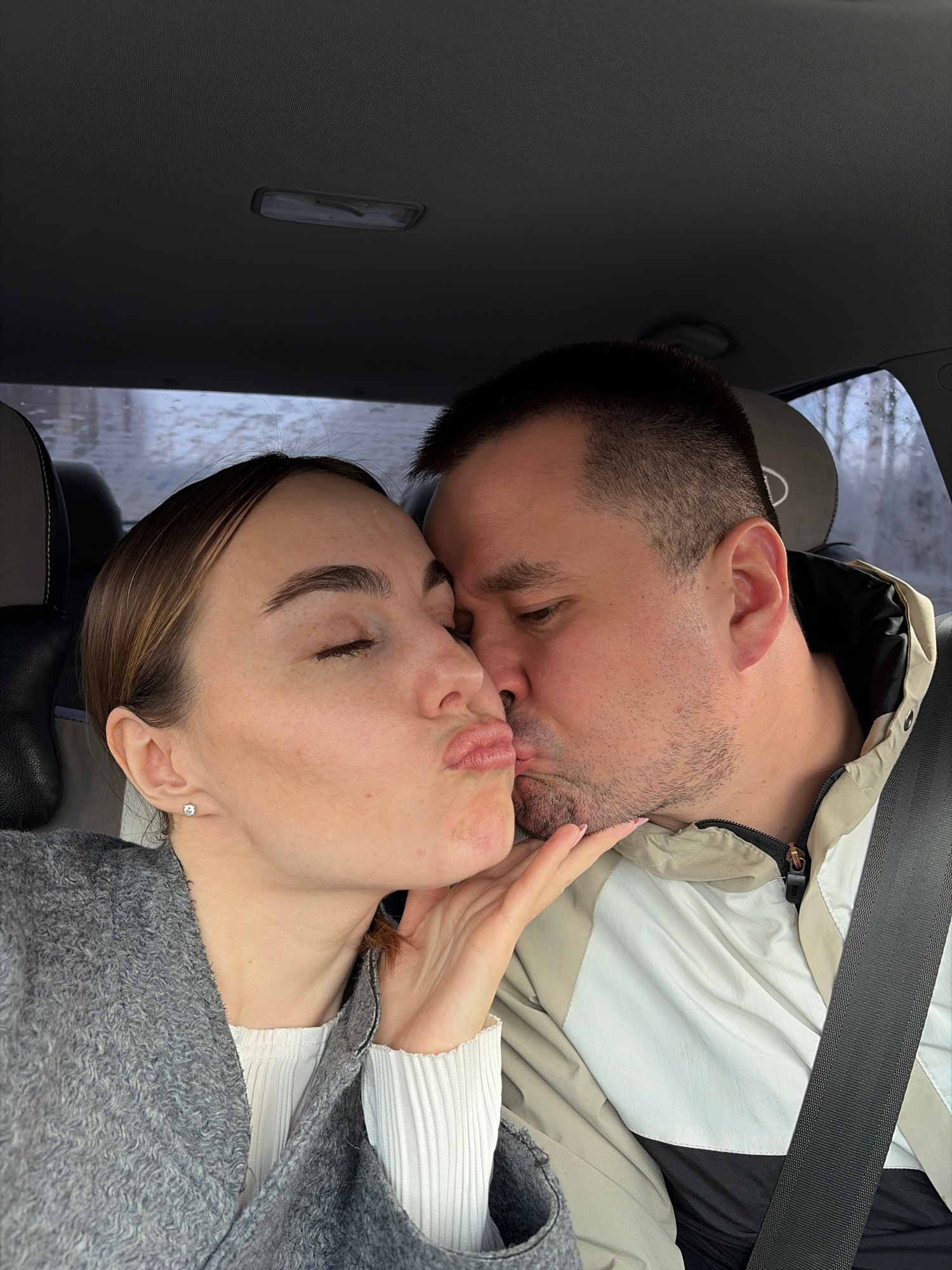 A man and a woman are embracing and kissing inside a car. The man is wearing a jacket with a white, black, and beige design and a seatbelt is visible. The woman is wearing a white shirt and a gray swe…read more