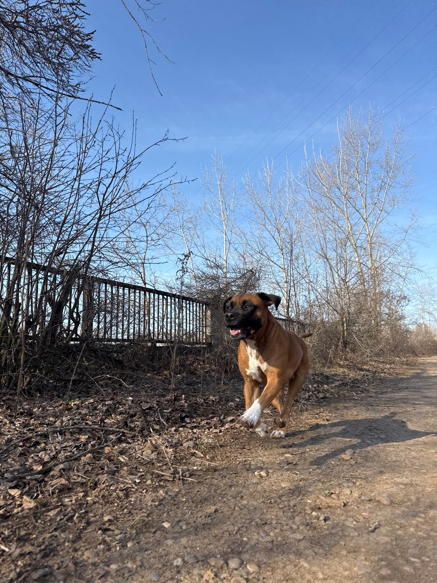 A Boxer dog is running along a dirt path in a park-like setting in Chaikovsky, Russia. The dog is brown and white with a black muzzle. It is looking toward the viewer with its tongue sticking out. The…read more