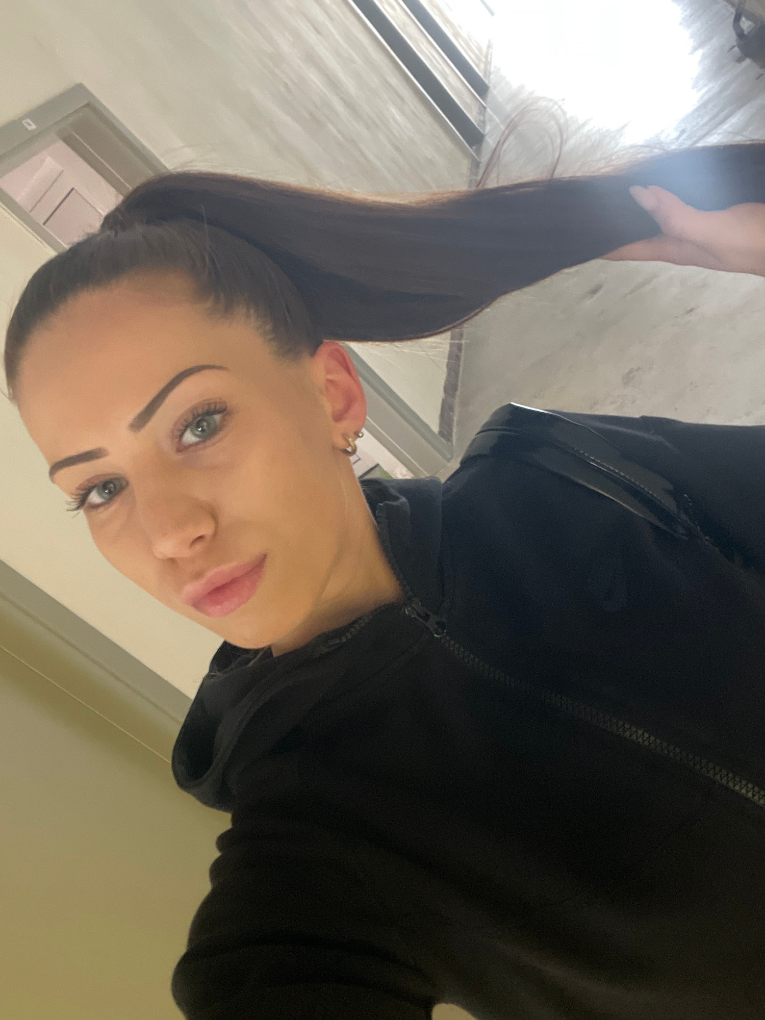 A woman with fair skin, blue eyes, and dark eyebrows is holding a thick strand of dark hair up, possibly her own. She is wearing a black zip-up hooded jacket. The background appears to be an interior…read more