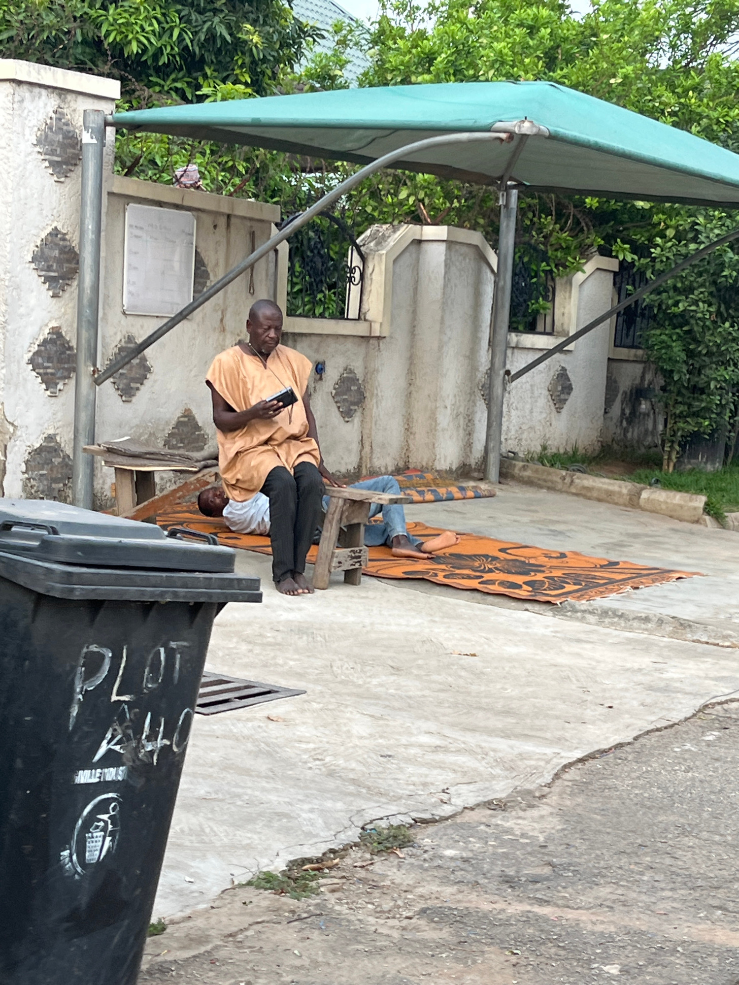 The image shows two men relaxing under a sunshade in Abuja, Nigeria. One man, dressed in an orange robe and black pants, is seated and looking at a cell phone. Another man is lying down with his head…read more