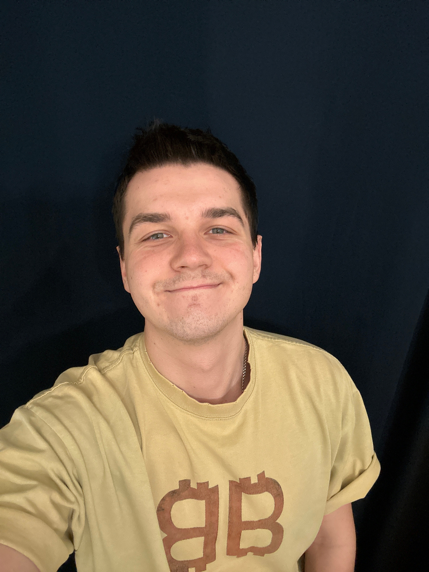 A medium shot depicts a young man with fair skin, dark hair, and blue eyes, smiling slightly at the camera. He is wearing a light yellow t-shirt with a large, brown "BB" logo on the front. A thin silv…read more