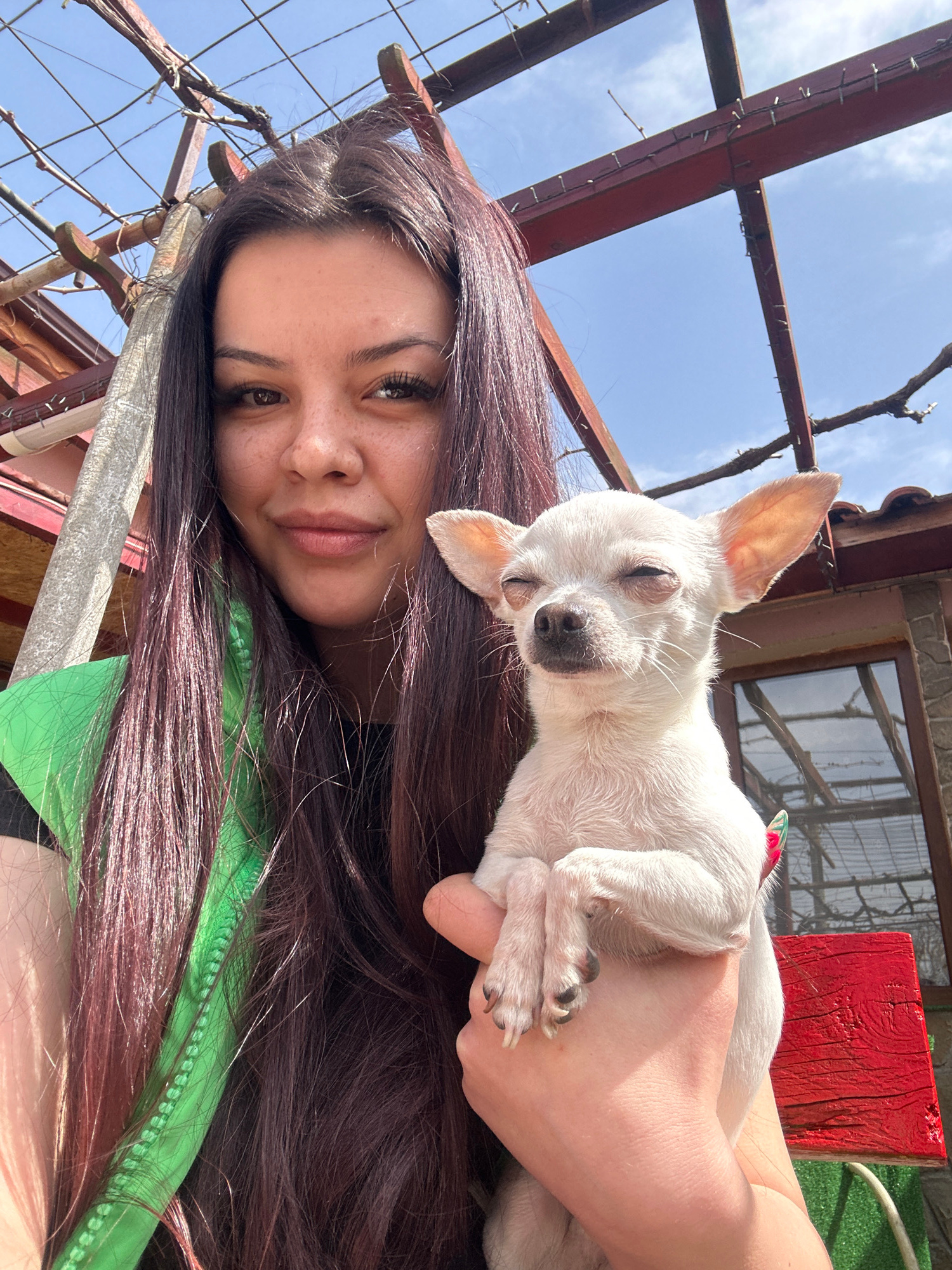 A woman with dark brown hair holds a white Chihuahua outside on a partially sunny day. The dog appears to be resting its head on the woman's hair, with its eyes closed. The woman is looking directly a…read more